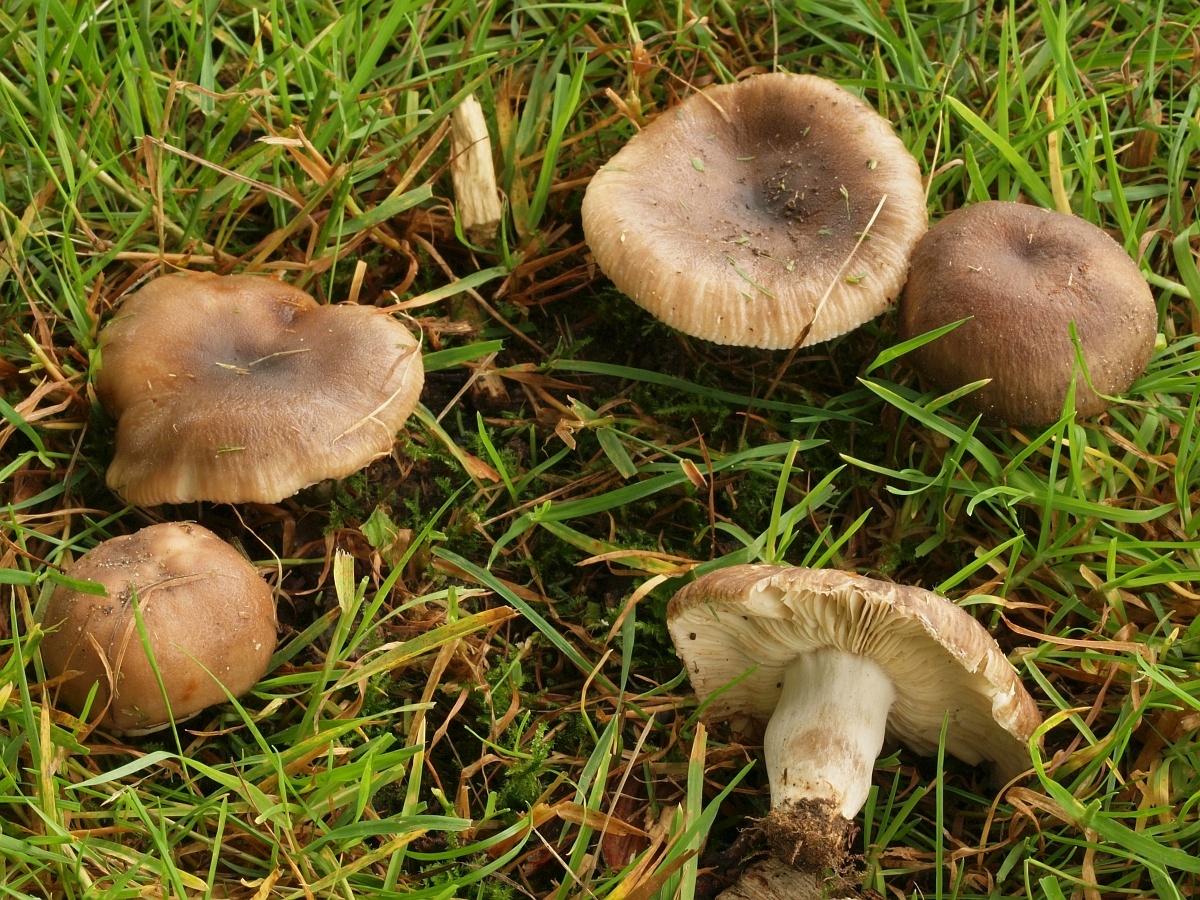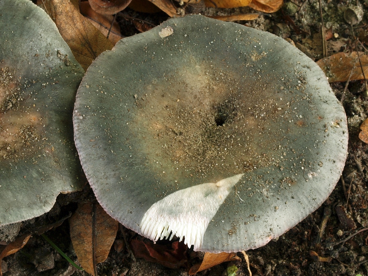 Dann gab es ein Massenvorkommen von ca. 150 Exemplaren des Blaugrünen Reiftäublings unter einigen Linden. In typischer Ausprägung mit vorhandenem Reif ist dieser milde Täubling mit blass cremefarbigem Sporenpulver oft gut anzusprechen. Ein wichtiges Merkmal ist das Fehlen jeglicher violettlicher Töne unter der Huthaut. Sicherheit bei der Bestimung geben oft erst die partiell netzigen Sporen. Beim Ausblassen von der Mitte her, aber manchmal auch von Beginn an, treten mehr Brauntöne in den Vordergrund Ähnlich ist R. plumbeobrunnea, jedoch in der ITS-Region identisch.
