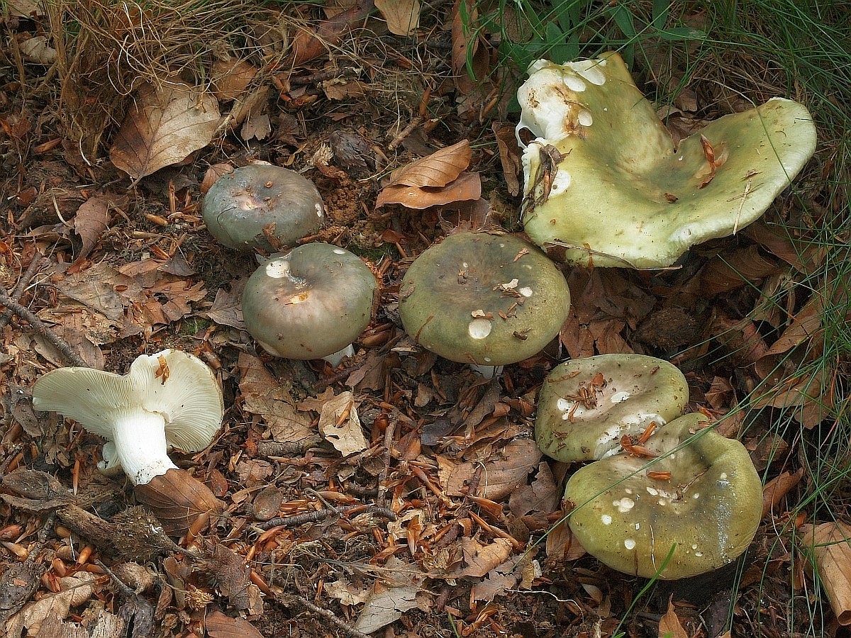 Selten habe ich so viele Frauentäublinge gesehen und man hätte mehrere Körbe füllen können was wir uns allerdings verkniffen haben. Das hätte angesichts diverser rothütiger und weitere Arten, die einige Bestimmungsarbeit erforderten, einfach zuviel Zeit gekostet. Auffallend war, dass nahezu ausschließlich Grüntöne dominierten und man musste immer wieder prüfen, ob die Lamellen wirklich speckig waren oder ob sich andere Arten wie der Grüne Speisetäubling (R. heterophylla) dazwischen befanden. Ich schreibe bewusst nicht elastisch, da es einige Arten ohne splitternde Lamellen gibt, die häufiger für Frauentäublinge gehalten werden. Beim Frauentäubling kann man die Lamellen unter dem Daumen zerquetschen und es fühlt sich fast an, als ob man über eine Speckschwarte reibt. Die grünen Formen wurden früher als Varietät pelteraui abgetrennt aber genetisch gibt es wohl keinen Unterschied zur Normalform.