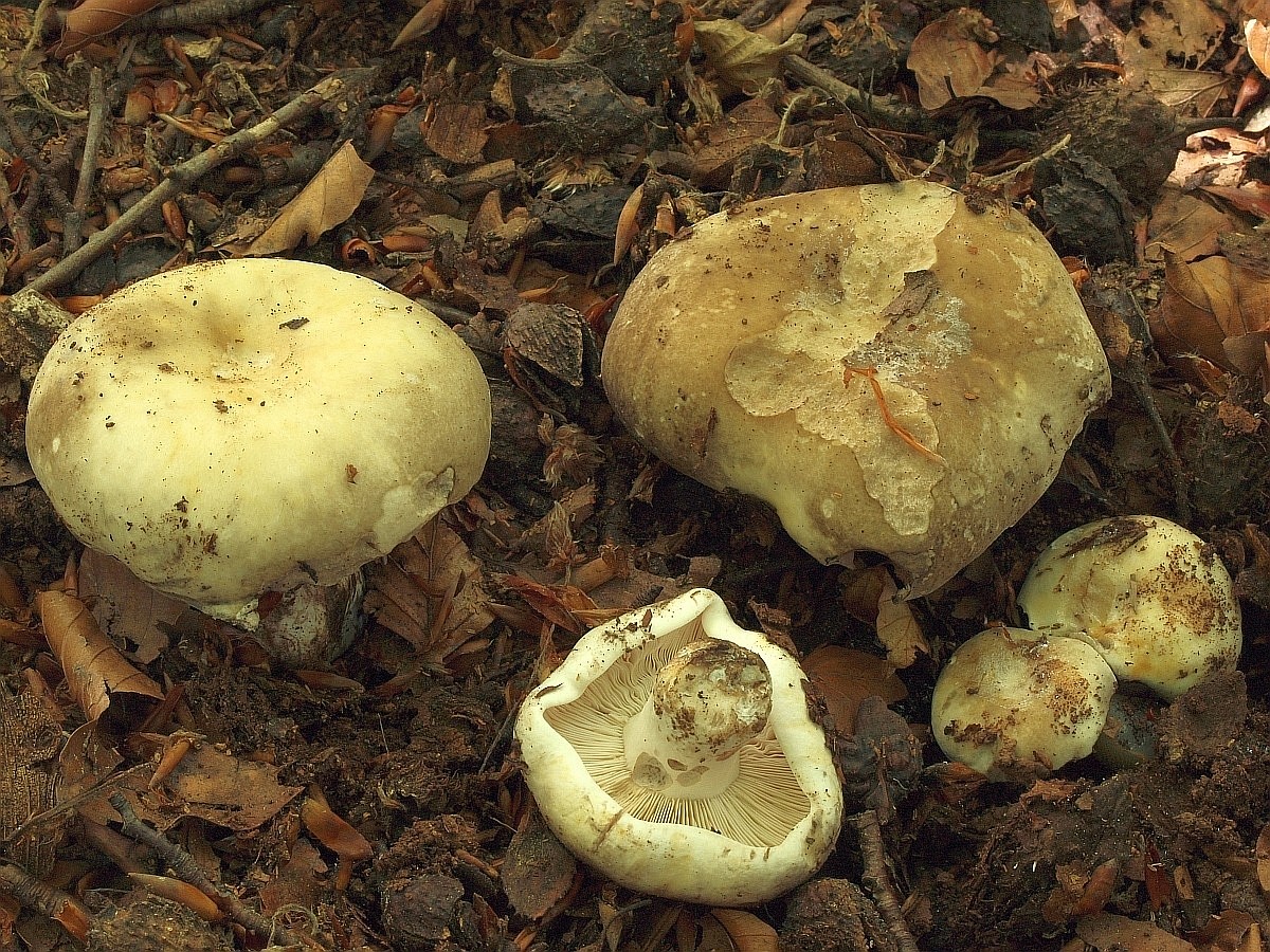 Dann gab es ein Massenvorkommen von ca. 150 Exemplaren des Blaugrünen Reiftäublings unter einigen Linden. In typischer Ausprägung mit vorhandenem Reif ist dieser milde Täubling mit blass cremefarbigem Sporenpulver oft gut anzusprechen. Ein wichtiges Merkmal ist das Fehlen jeglicher violettlicher Töne unter der Huthaut. Sicherheit bei der Bestimung geben oft erst die partiell netzigen Sporen. Beim Ausblassen von der Mitte her, aber manchmal auch von Beginn an, treten mehr Brauntöne in den Vordergrund Ähnlich ist R. plumbeobrunnea, jedoch in der ITS-Region identisch.