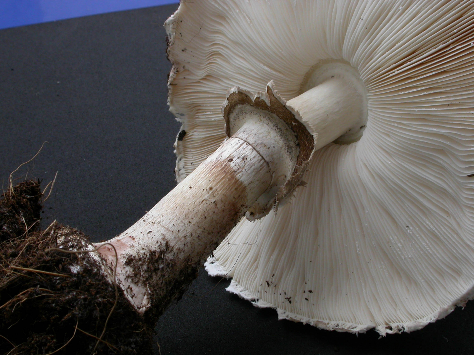 Die Unterseite des Velum partiale ist jetzt braun, das Velum universale weiß, man sieht die Abrisszone.