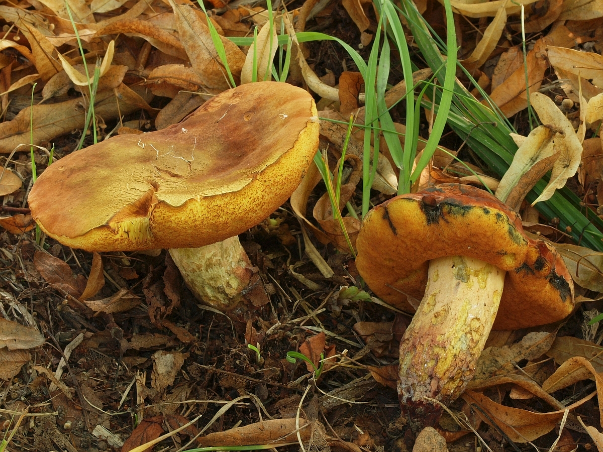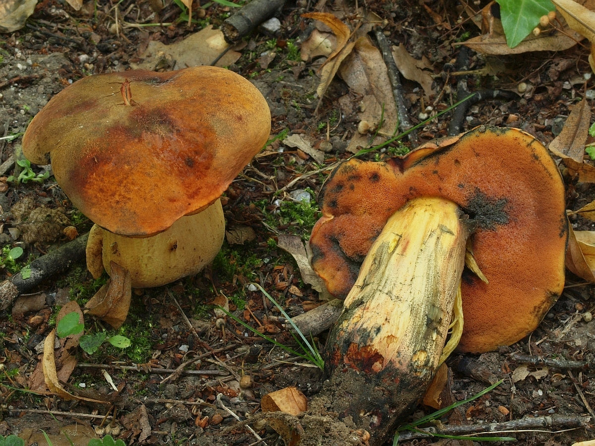 Suillellus luridus s. str. hat auch das weinrote Fleisch in der Stielbasis. Suillellus luridus var. queletiiformis wird (wenn man das anerkennen will) aufgrund der Hutfarben (ohne Oliv, mehr Orangetöne ) und des oft aber nicht immer gelben Röhrenbodens abgetrennt (etwas sehr dünn, finde ich).