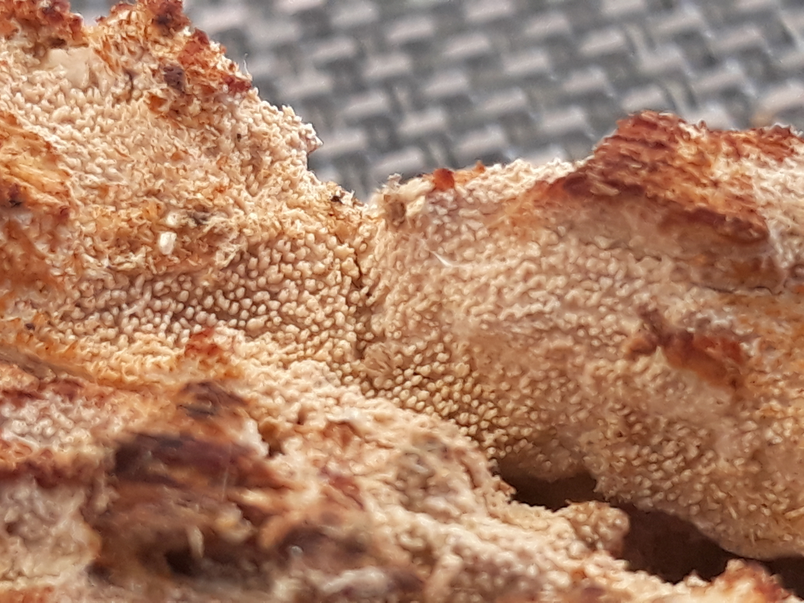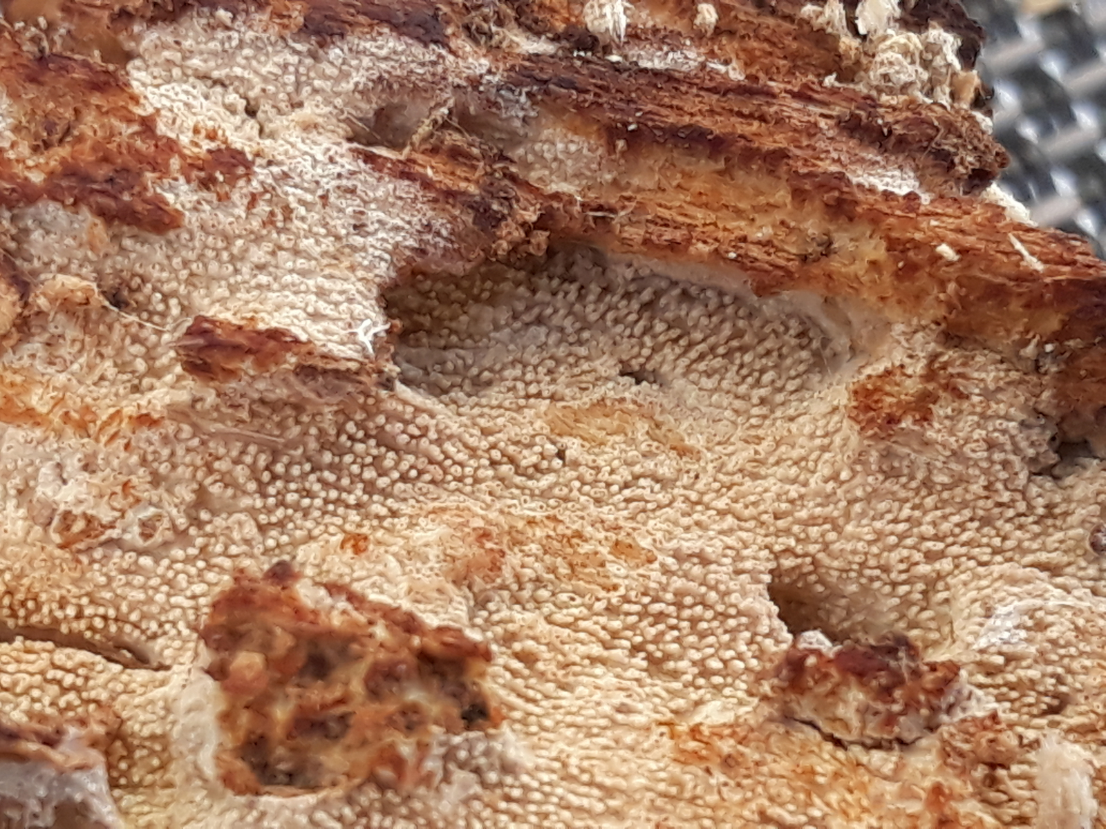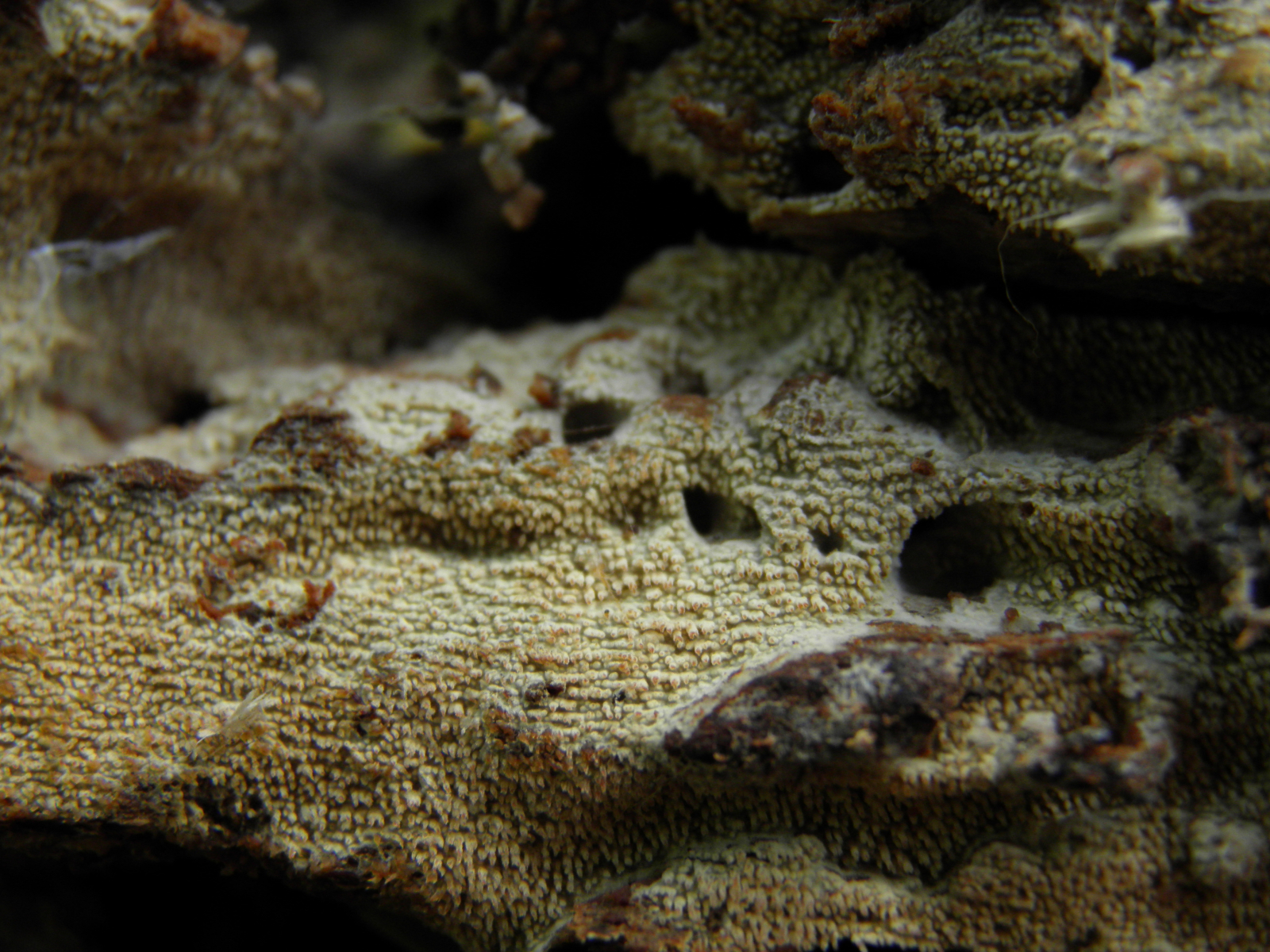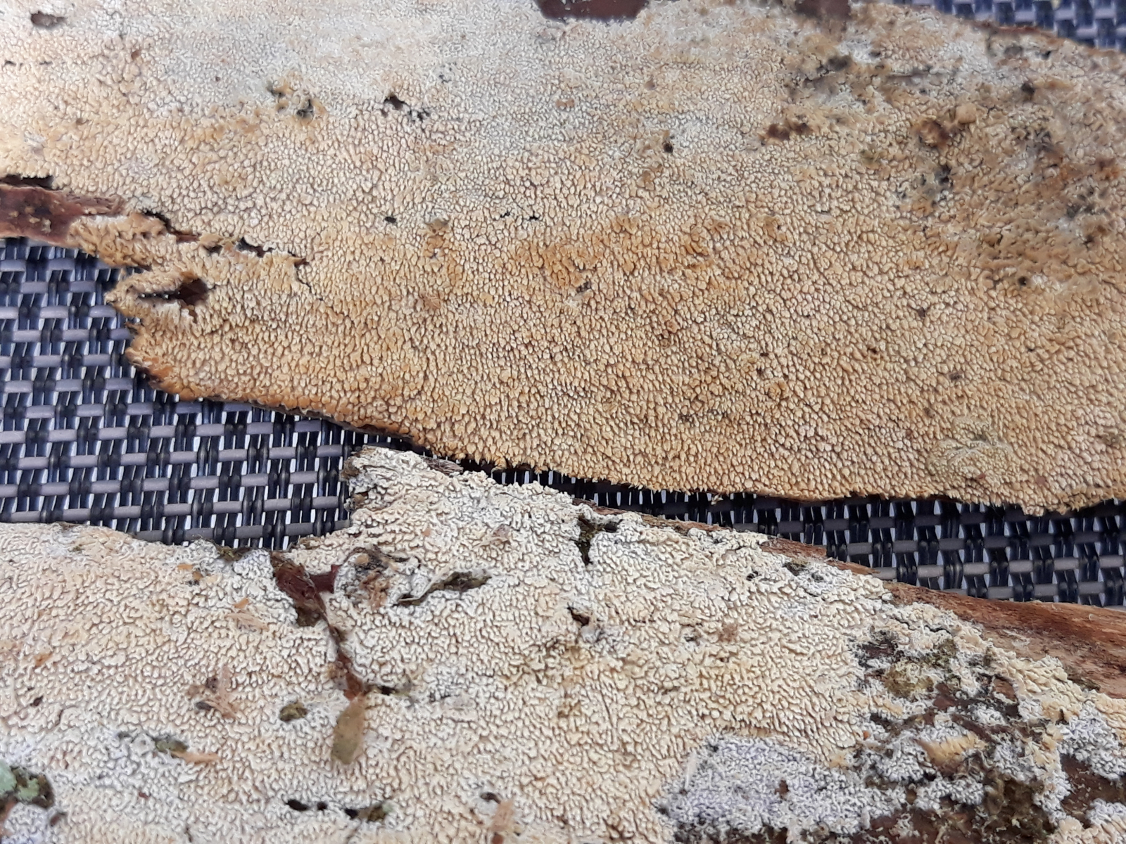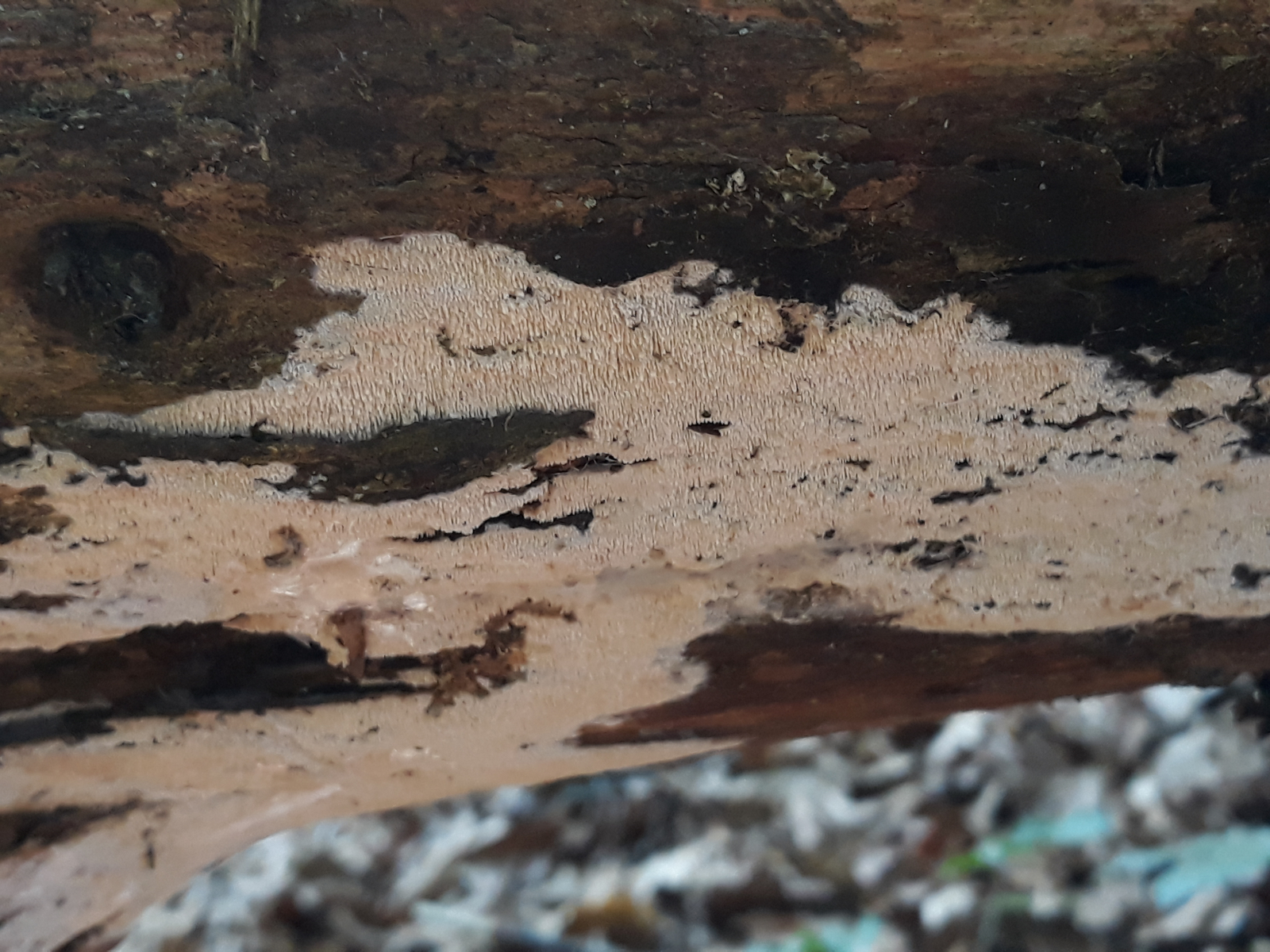 3 Hier ein "Zahnbelag" von der Unterseite einer sehr morschen Buchen, die Zähnchen sind winzig, der ganze Pilz ist extrem dünn.