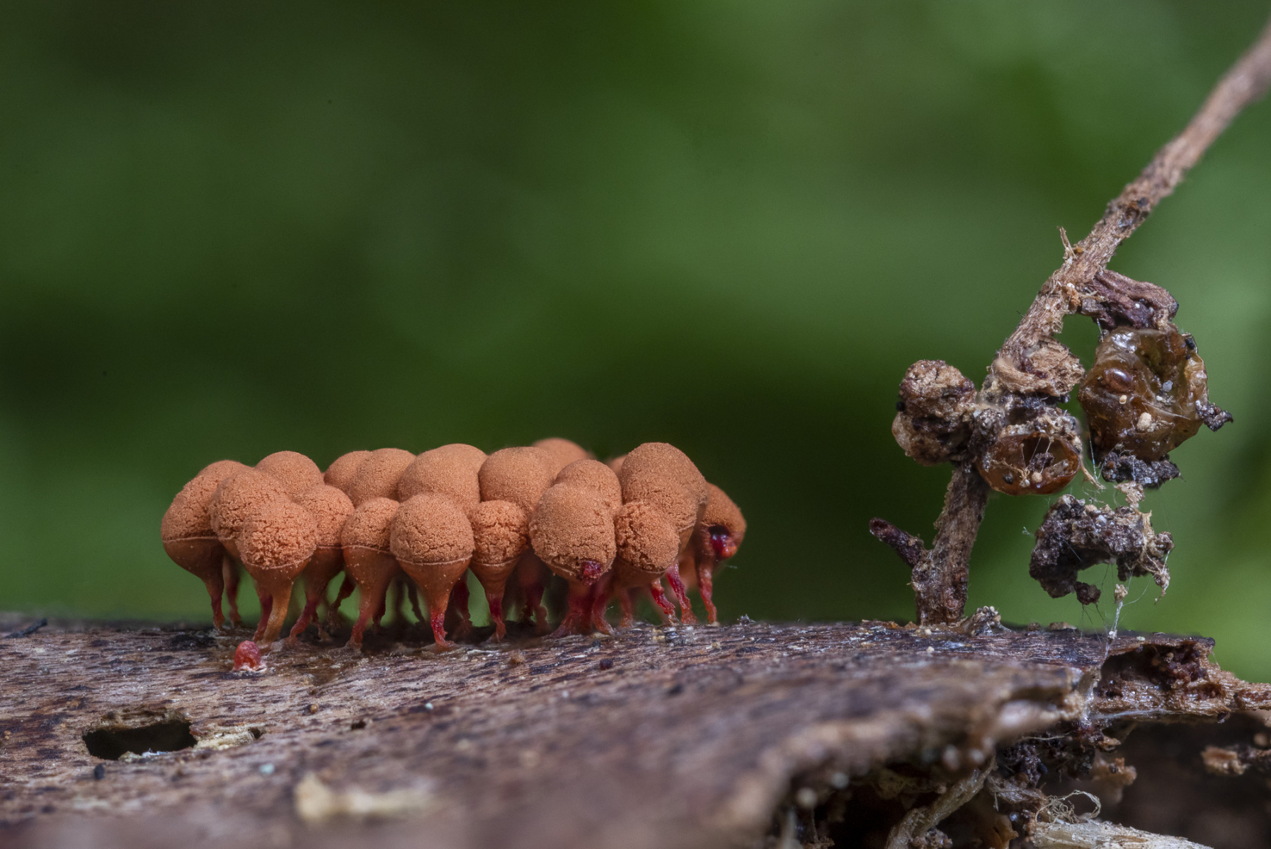 Am nächsten Tag waren die 4 zurückgelassenen Sporokarpiengruppen verschwunden (es gibt viele Tiere, die sich Schleimpilze schmecken lassen).