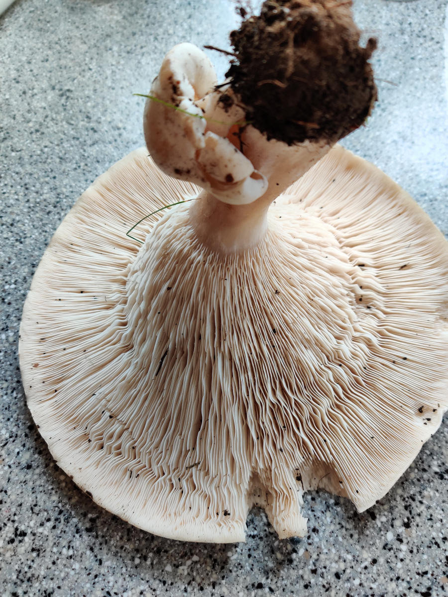 Gefunden habe ich ihn auf einer Wiese. Ich persönlich finde er riecht leicht unangenehm Mehlig. Der Stiel ist weiß gelblich und sehr fest. Im Trichter befindet sich kein Huppel wie beim Mönchskopf. Die Lamellen sich ziemlich brüchig. Der Hut ist weiß mit leicht braun gelblichen nuancen. Könnte es sich auch um einen weißen Krempentrichterling handeln?
