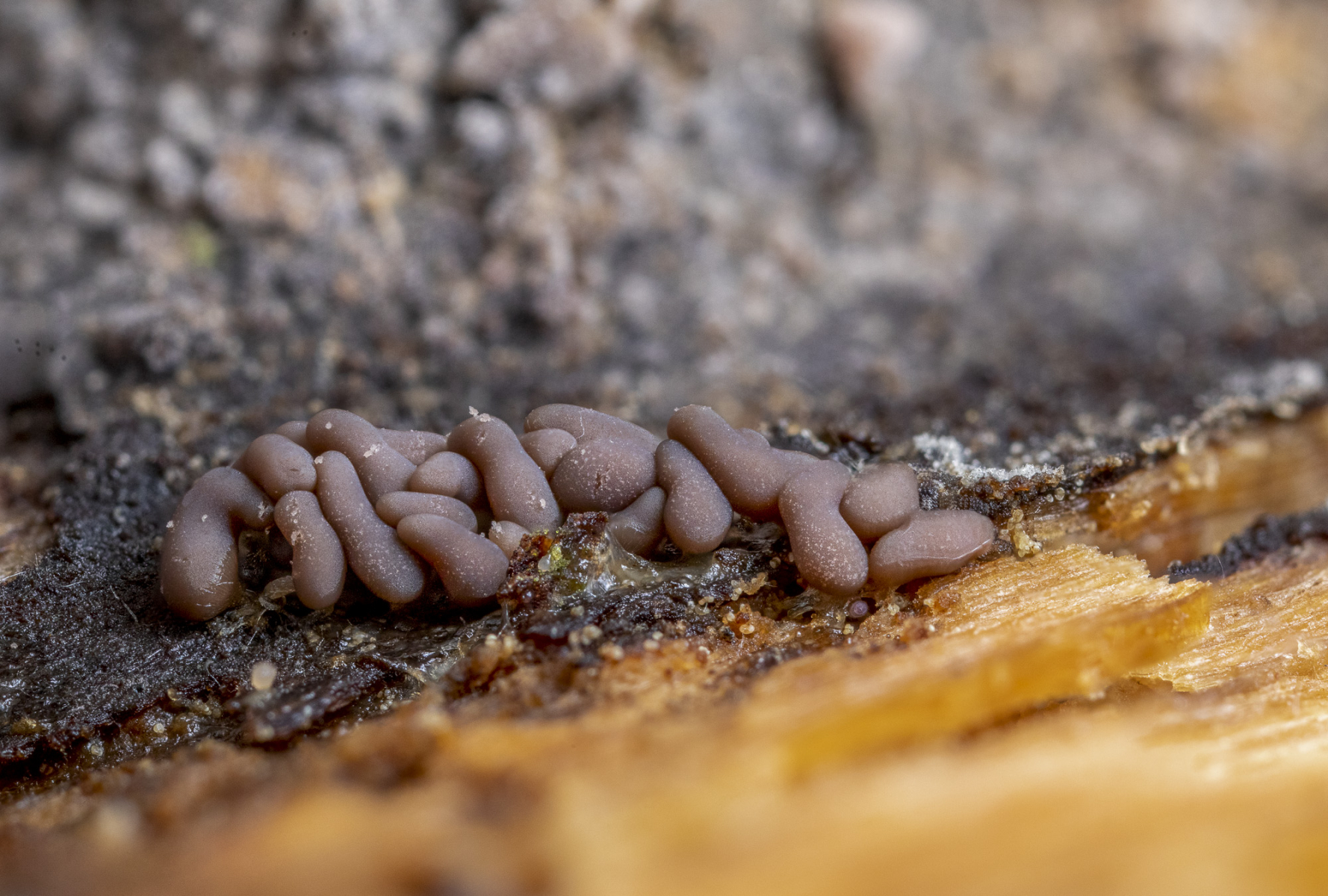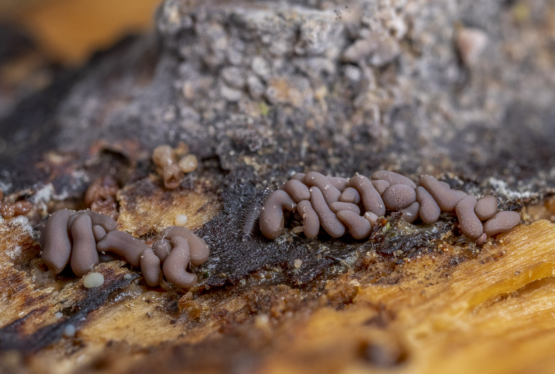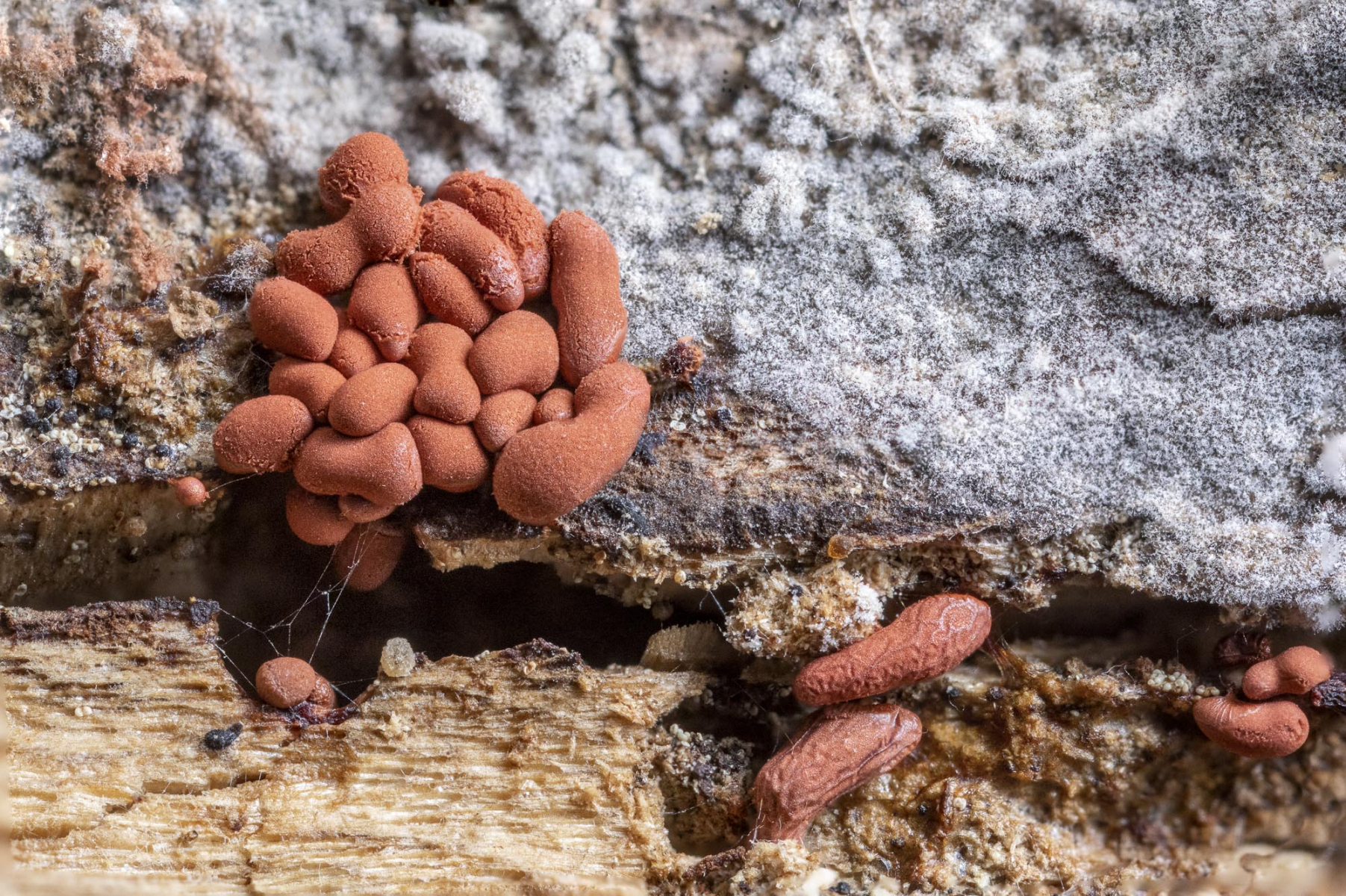 Diesen Schleimpilz halte ich für Arcyra, aber welche Art genau? Für Arcyria ist der Schleimer recht klein (die Fruchtkörpergruppe auf Bild 2 ist nur etwa 0,5 cm breit und die Gruppe auf Bild 3 ist nur etwa 0,3 cm breit)!
