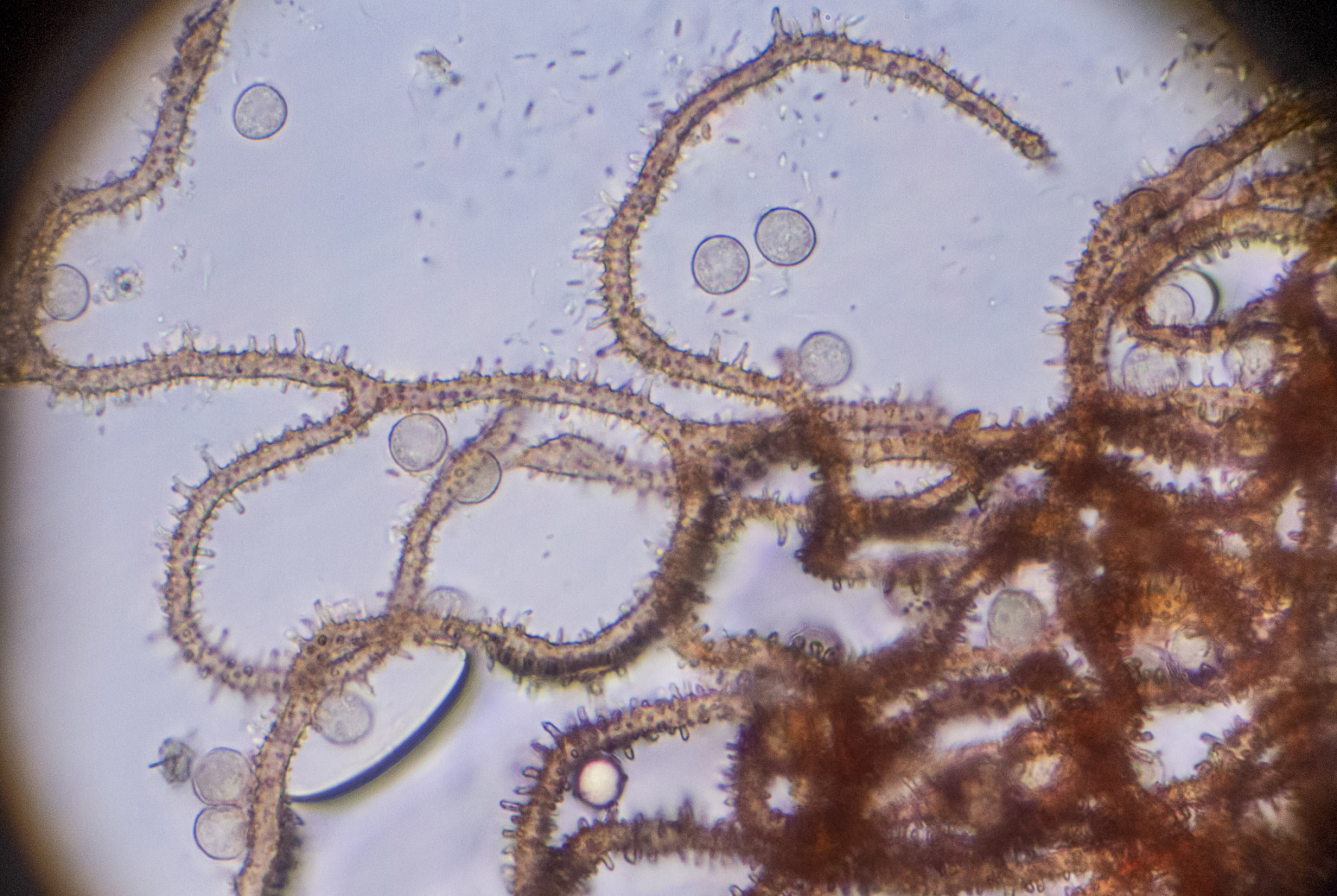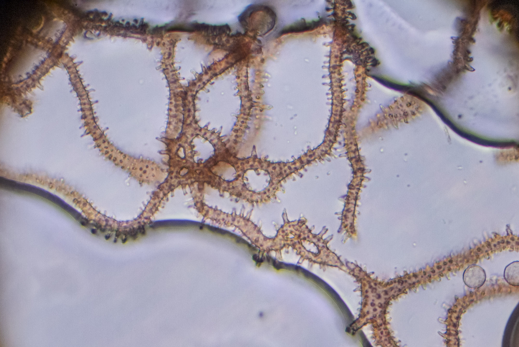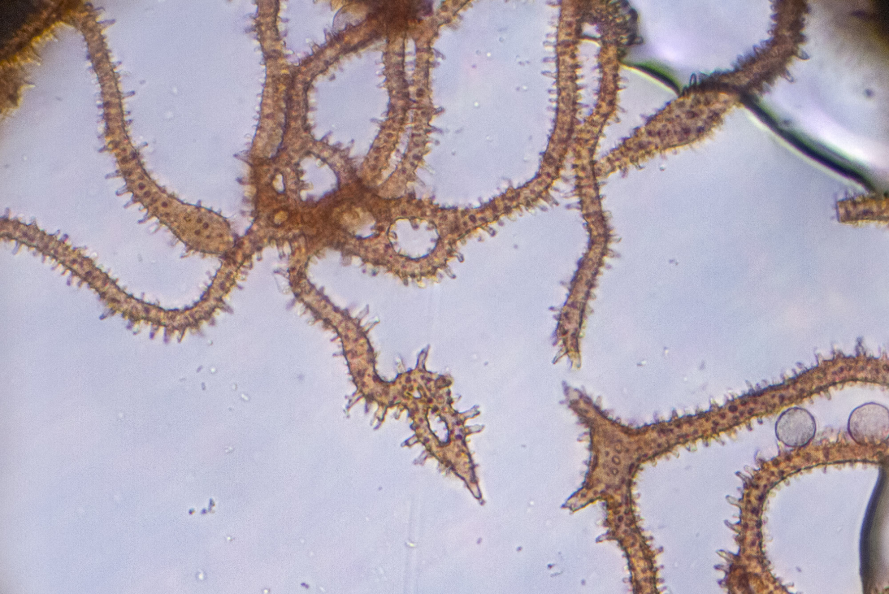 Das Capillitium passt irgendwie zu keiner der in "Die Myxomyceten" beschriebenen Arten. Ich finde nirgends Halbringe oder Ringe, aber zu den Arten mit einem Capillitium ohne Ringe und Halbringe passt es eigentlich auch nicht! Das Capillitium weist auch freie Enden auf; diese sind ein wenig verdickt. Die "Dornen" des Capillitiums sind bis etwa 5 µm lang aber nicht spitz sondern eher "keulig" oder "geweihartig".