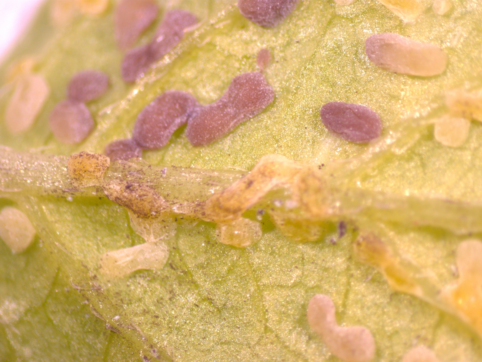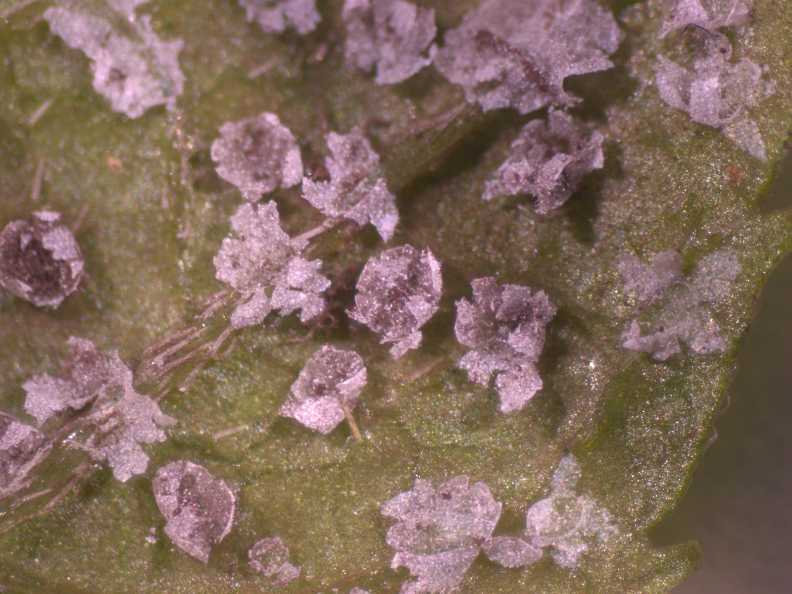 Diese Strukturen habe ich heute auf den Blattunterseiten von Hortensien entdeckt. Es ist ein Jungpflanzenbestand, feucht und warm. Es sieht für mich so aus, als ob die Blätter nur zum darauf wachsen genutzt werden, und nicht parasitiert werden. Handelt es sich um Schleimpilze? Vielen Dank im Voraus.