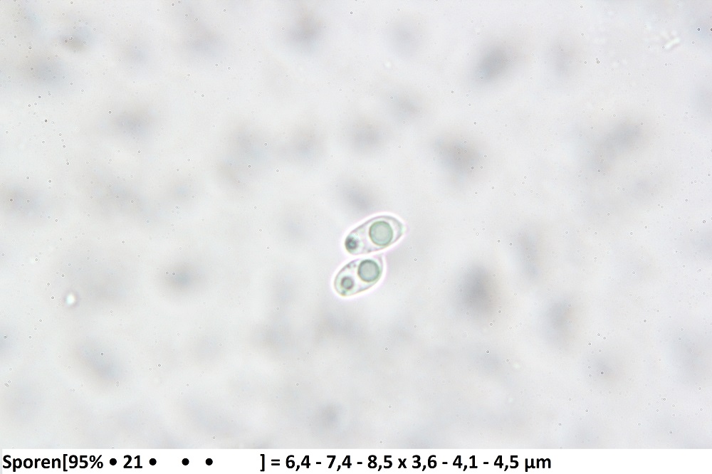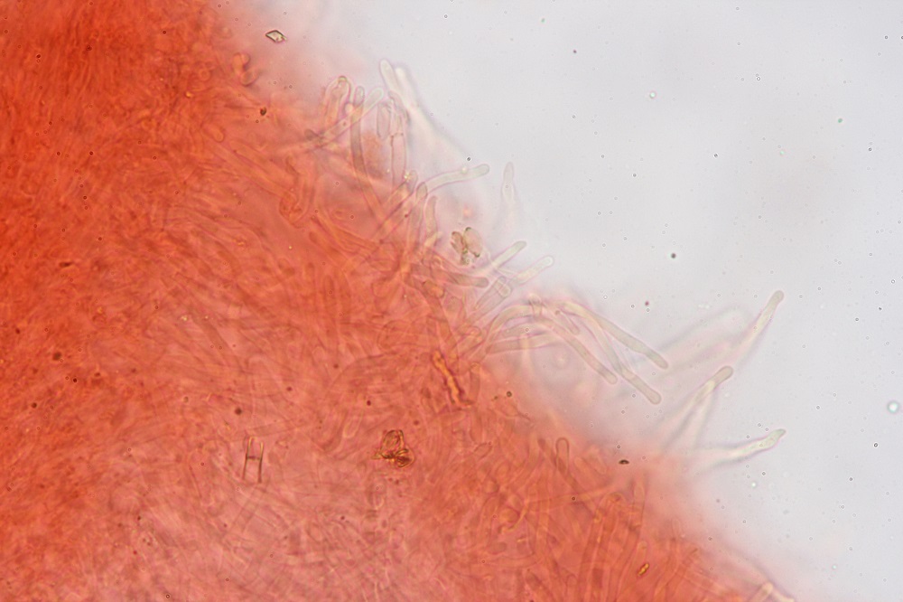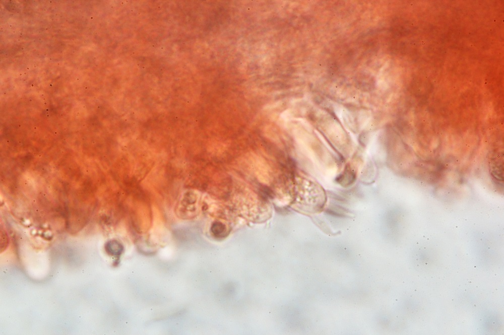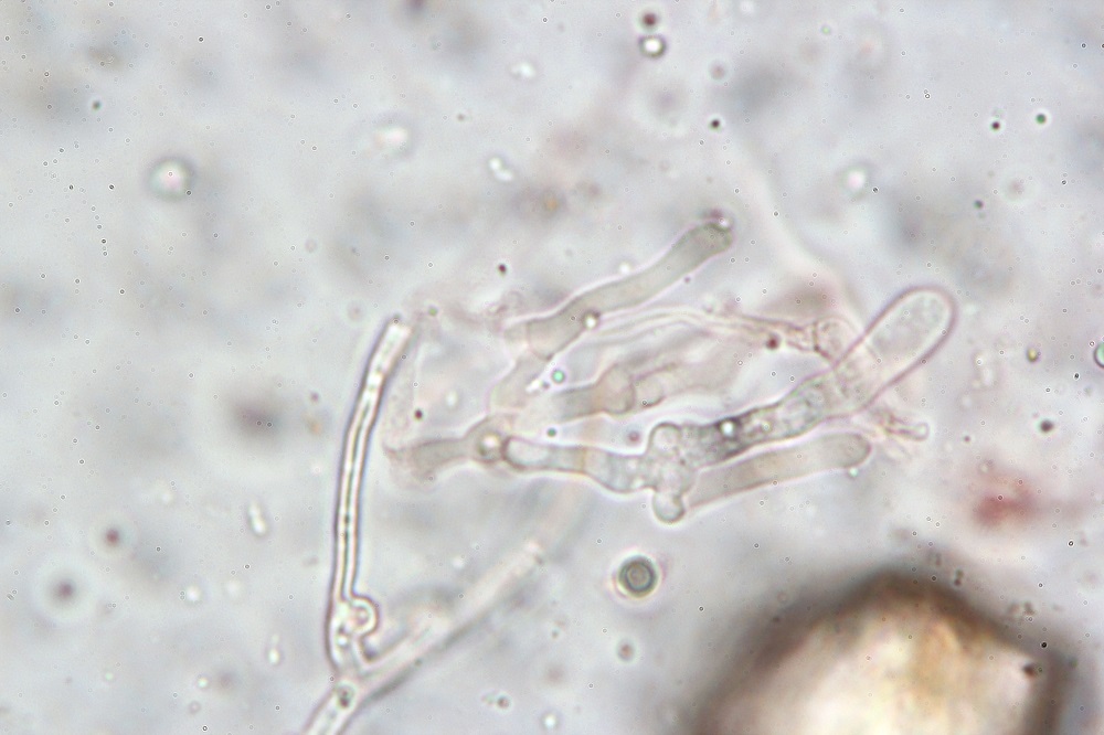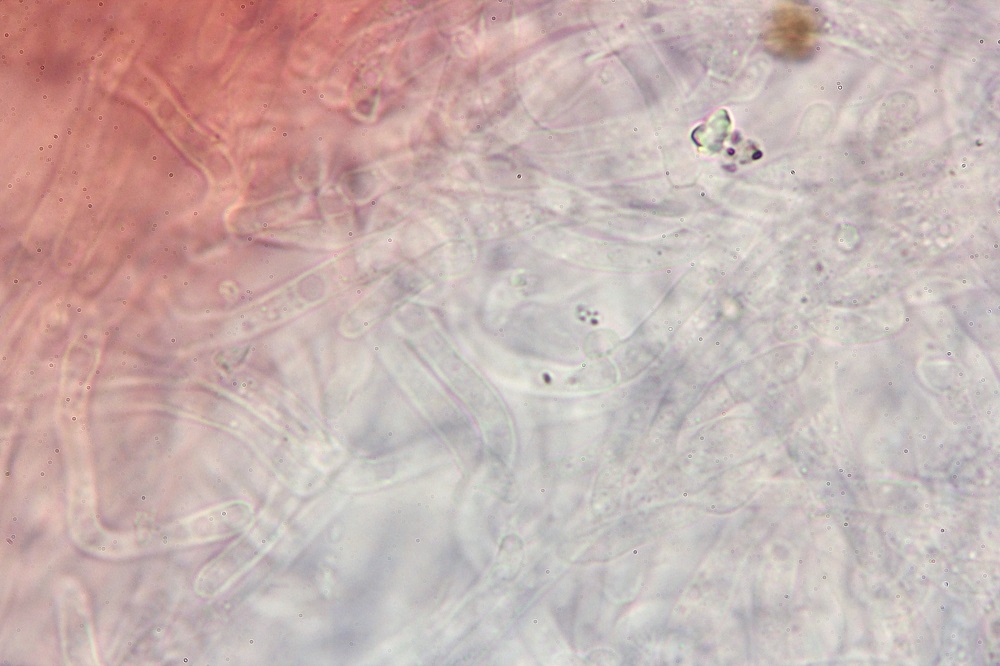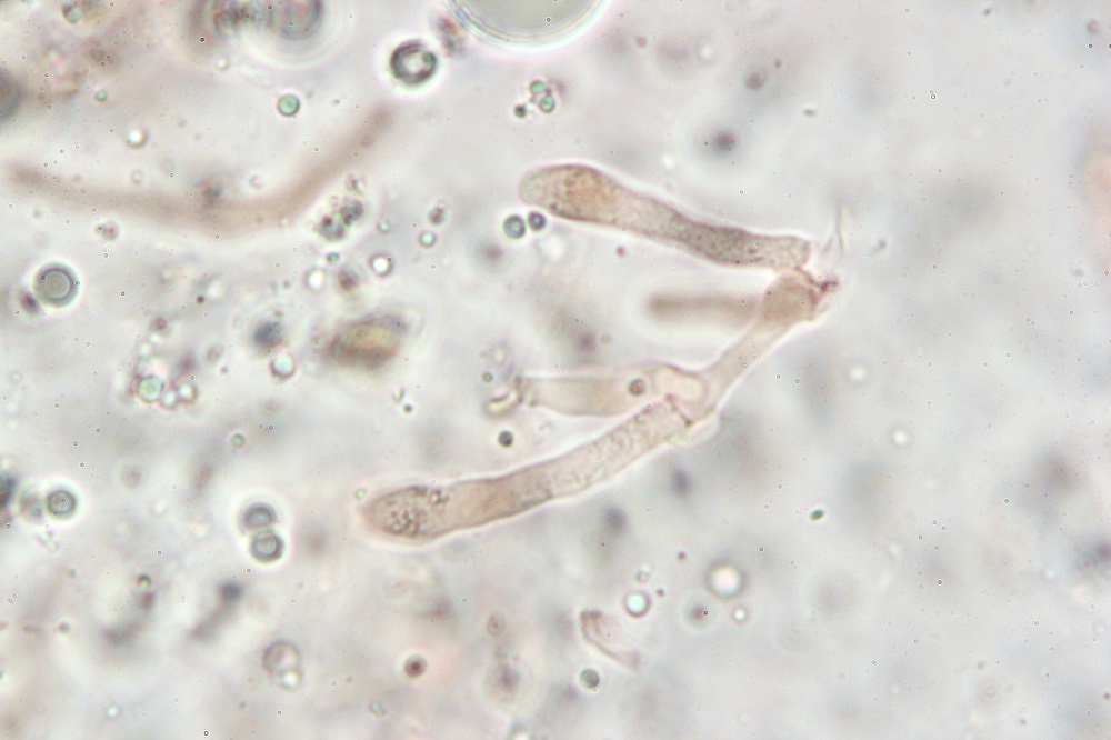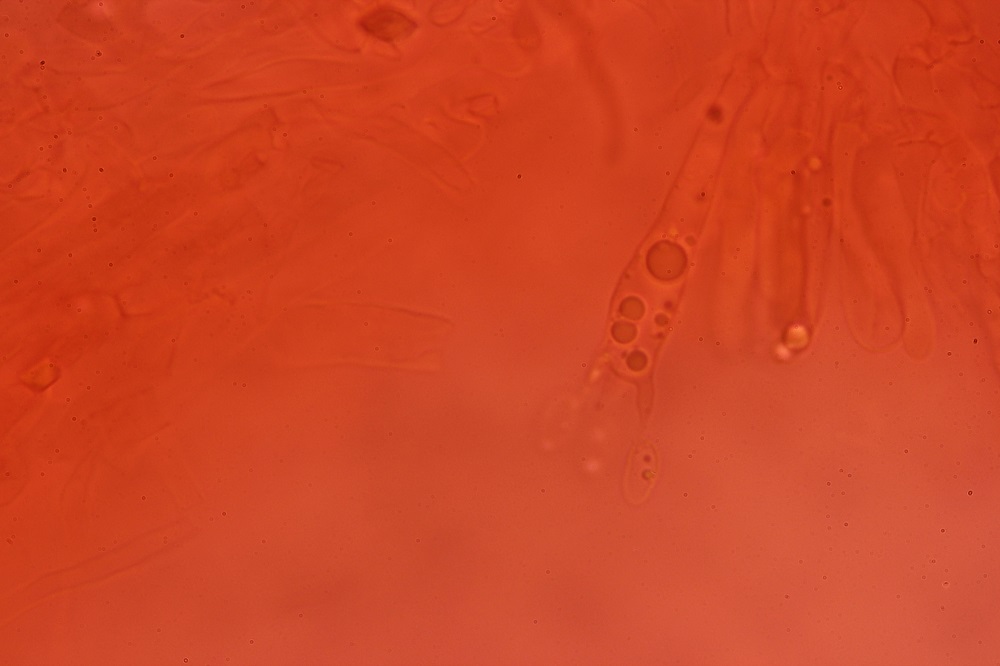 Es gab keine Cheilozystiden, dafür mehrfach verzweigte Basidiolen mit Schnallen. Auch Kaulozystiden konnte ich nicht finden.