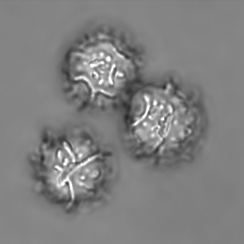 Bild 6: Drei Sporen im Grünkanal, als Z-Projektion. Und zwar nur die Bilder 40-80, also nur eine Halbschale der Sporen. Man will ja nicht noch die Rückseite übereinanderprojizieren (macht man beim focus stacking ja auch nicht).