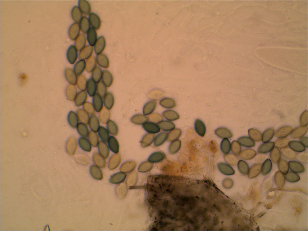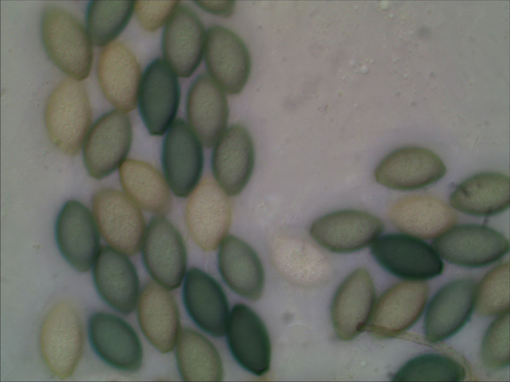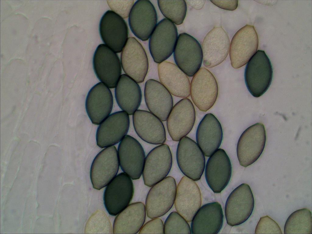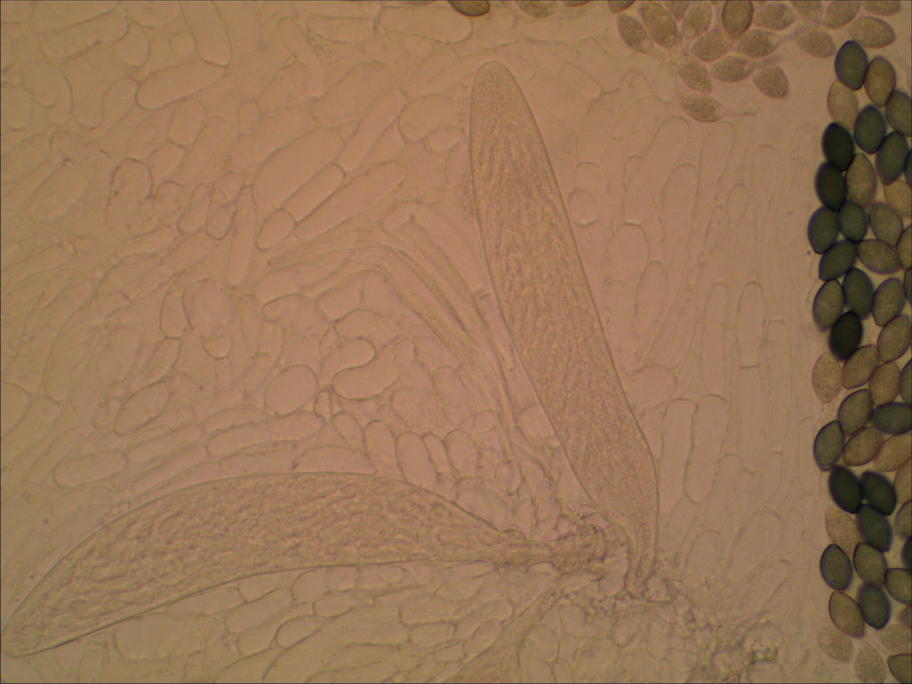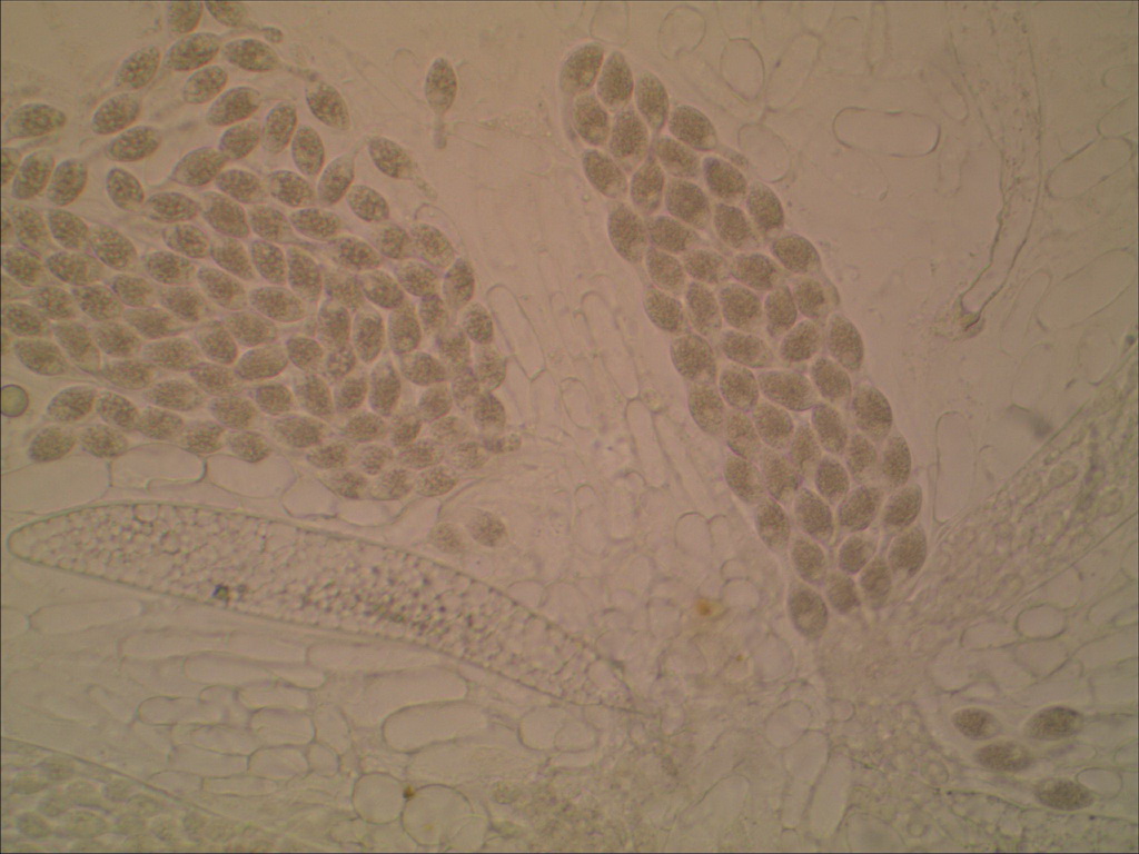Die hätte 128-sporige Asci, und ich denke das hat Deiner auch. Bild 6 zeigt links eine Menge Sporen, die recht sicher aus einem Ascus stammen sollten und das sind klar mehr als 64. Beim Quetschen drückt man bei so großen Asci gern mal einige Sporen raus, dann sind weniger im Inneren zu sehen als es ursprünglich waren.