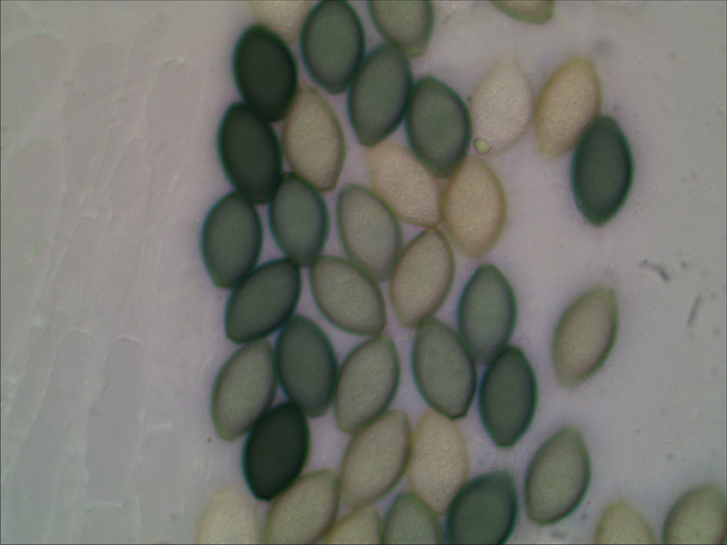 Die hätte 128-sporige Asci, und ich denke das hat Deiner auch. Bild 6 zeigt links eine Menge Sporen, die recht sicher aus einem Ascus stammen sollten und das sind klar mehr als 64. Beim Quetschen drückt man bei so großen Asci gern mal einige Sporen raus, dann sind weniger im Inneren zu sehen als es ursprünglich waren.