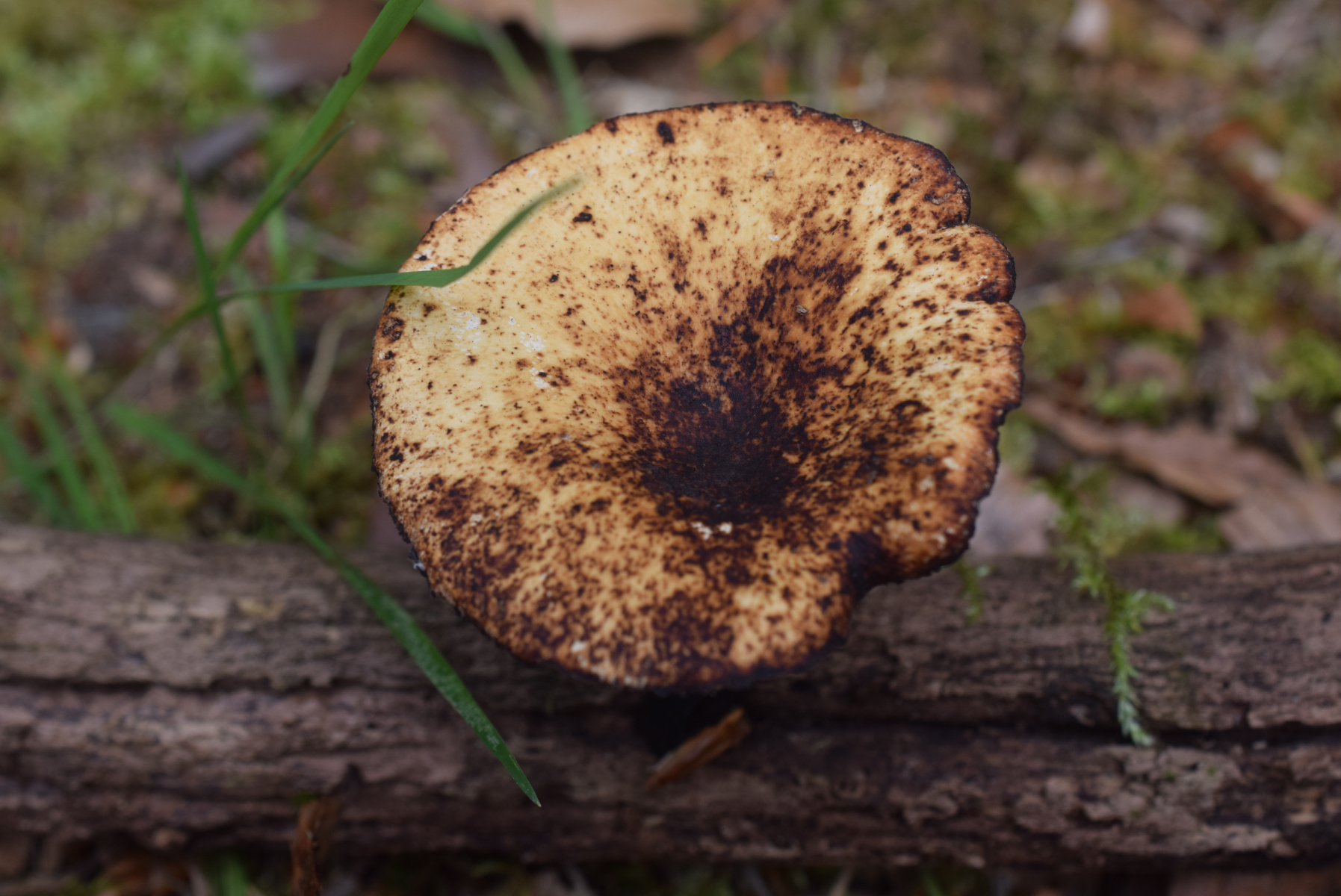 Der >Sklerotienporling< ist aber auch wirklich verzwickt in diesem Fall, weil die Poren ja bis zur Basis am Stiel herablaufen. Das Verhalten ist in der Tat eher für >Wabenporlinge< typisch. Hier verraten ihn jedoch die Hutschuppen mit ihren zugespitzten und aufgerichteten Enden. Das kann der Wabenporling nicht.