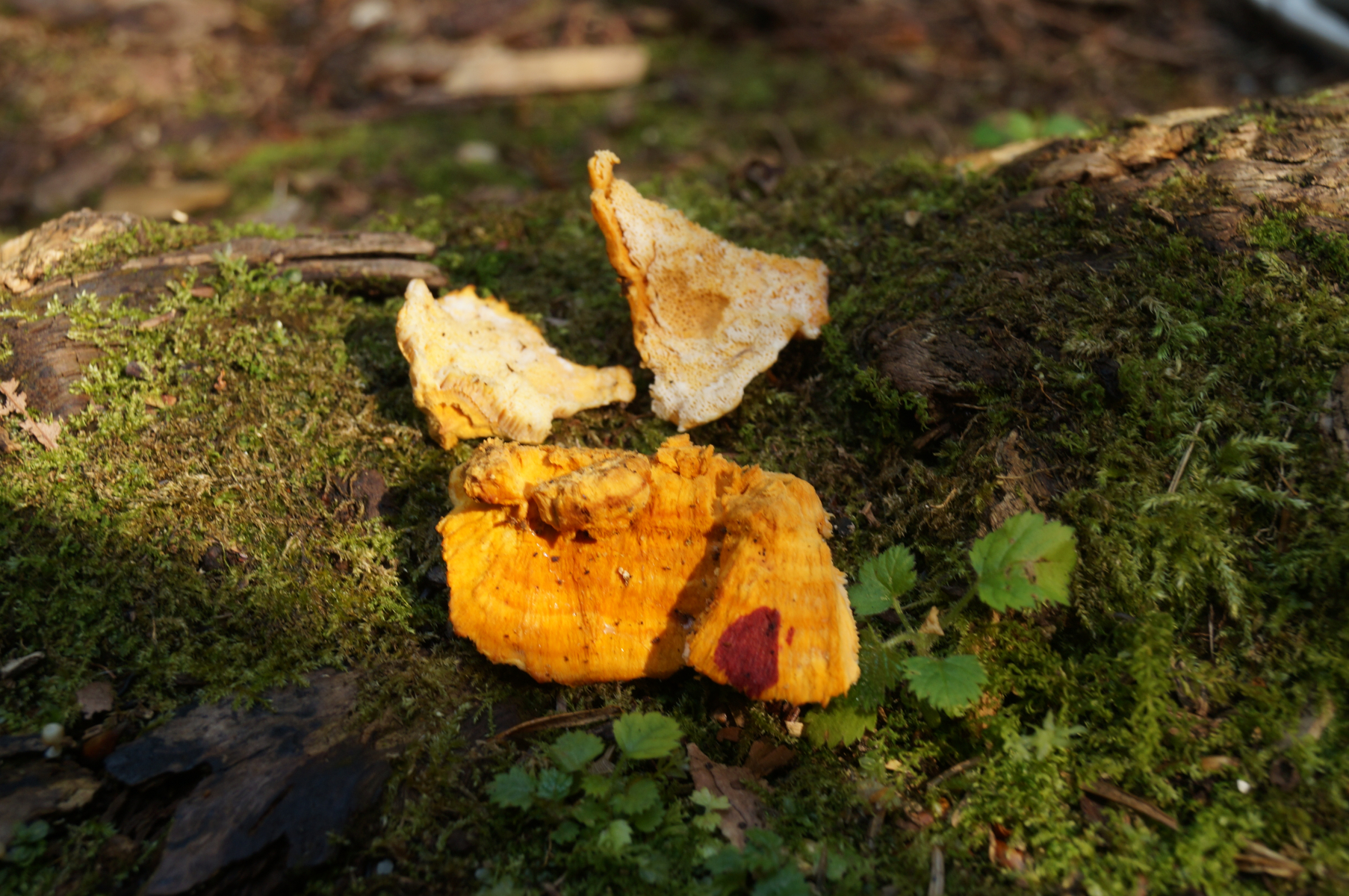 Pycnoporellus fulgens - Leuchtender Weichporling; wird mit KOH blutrot. Hier muss man aber aufpassen. Hapalopilus croceus macht das auch.