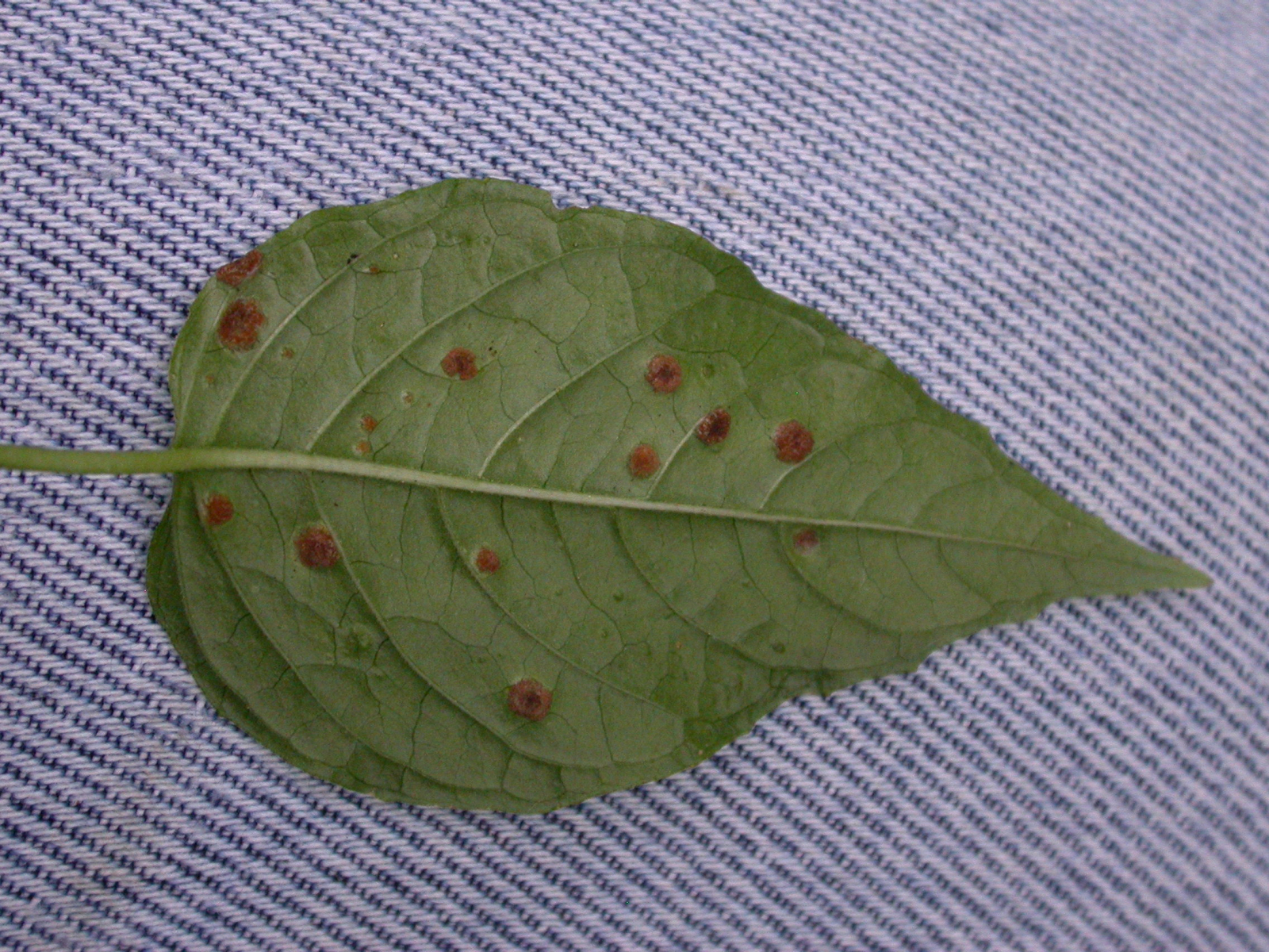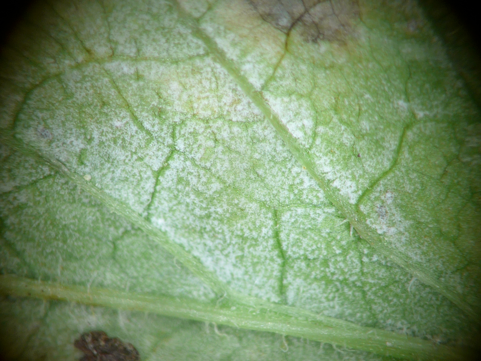 Tagsüber hatte ich natürlich noch ein paar Blättchen mitgenommen und abends noch nachbestimmt. Der hier war leicht. Ramularia lapsanae an Rainkohl.
