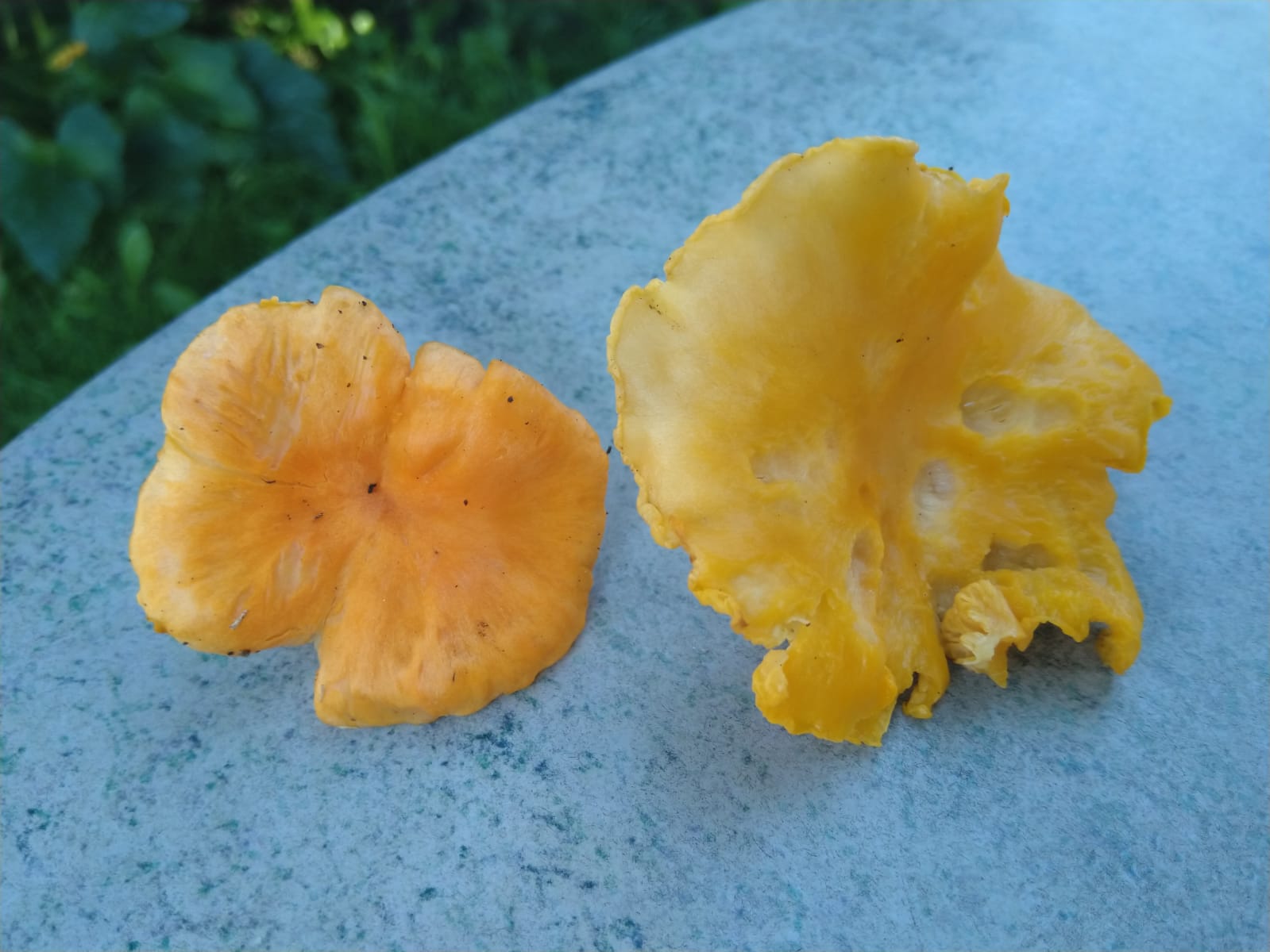 Wir haben heute eine reichliche Portion Pfifferlinge gefunden. Normalerweise gibt es bei uns am Standort entweder schöne gelbe (Echte-) Pfifferlinge oder Violettschuppige Pfifferlinge. Heute haben wir an einem Standort jedoch ungewöhnlich orange farbene Pfifferlinge gefunden. Vom Geruch sind sie wie die anderen Pfifferlinge. Nachdem wir doch etwas verunsichert sind, wollten wir die Fotos mal kurz hier rein stellen. Ich hatte mir auch gedacht, einen falschen Pfifferling gut von einem echten Pfifferling unterscheiden zu können. Ich habe mir auch schon Bilder von Ölbaumpilzen angesehen.