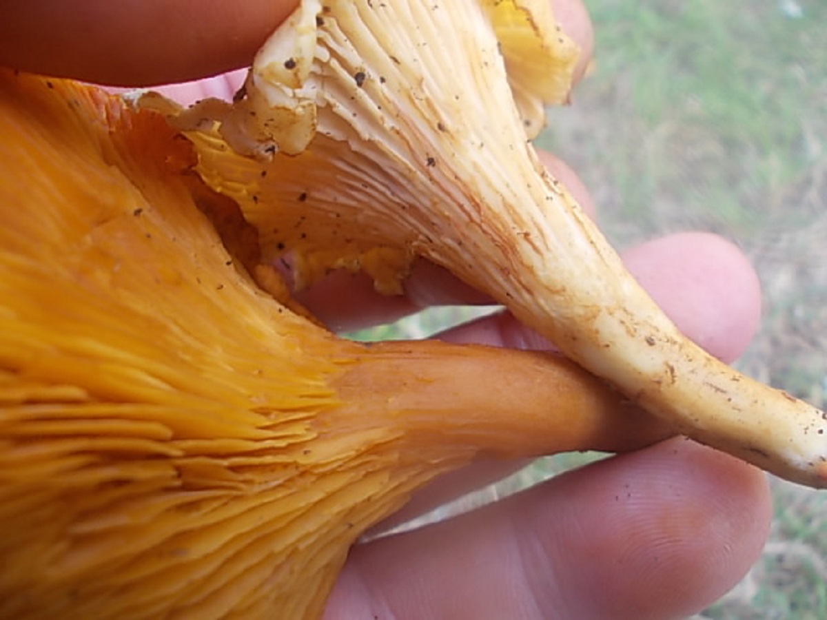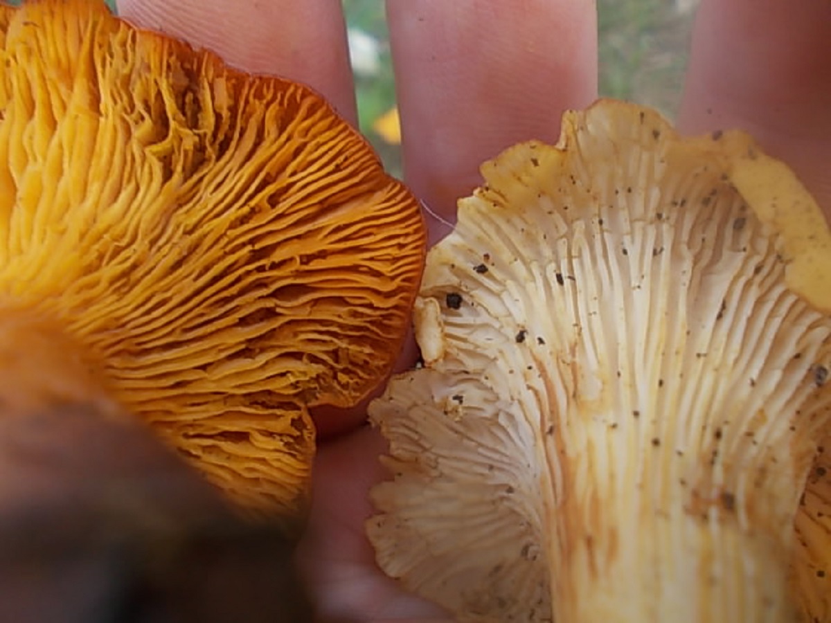 Das meiner Meinung nach eindeutigste Merkmal, um die Pfifferlingsarten von Falschem Pfifferling, Ölbaumtrichterling, usw zu unterscheiden, das sind die Leisten. Diese sind immer fest mit dem Fleisch verbunden, sehen auch ein wenig wie Falten aus. Im Gegensatz dazu die Lamellen der Verwechslungspartner. Diese sind mehr oder weniger leicht vom Hutfleisch zu lösen. Dazu sagt man ja auch Blätter und so in etwa sehen die auch aus.