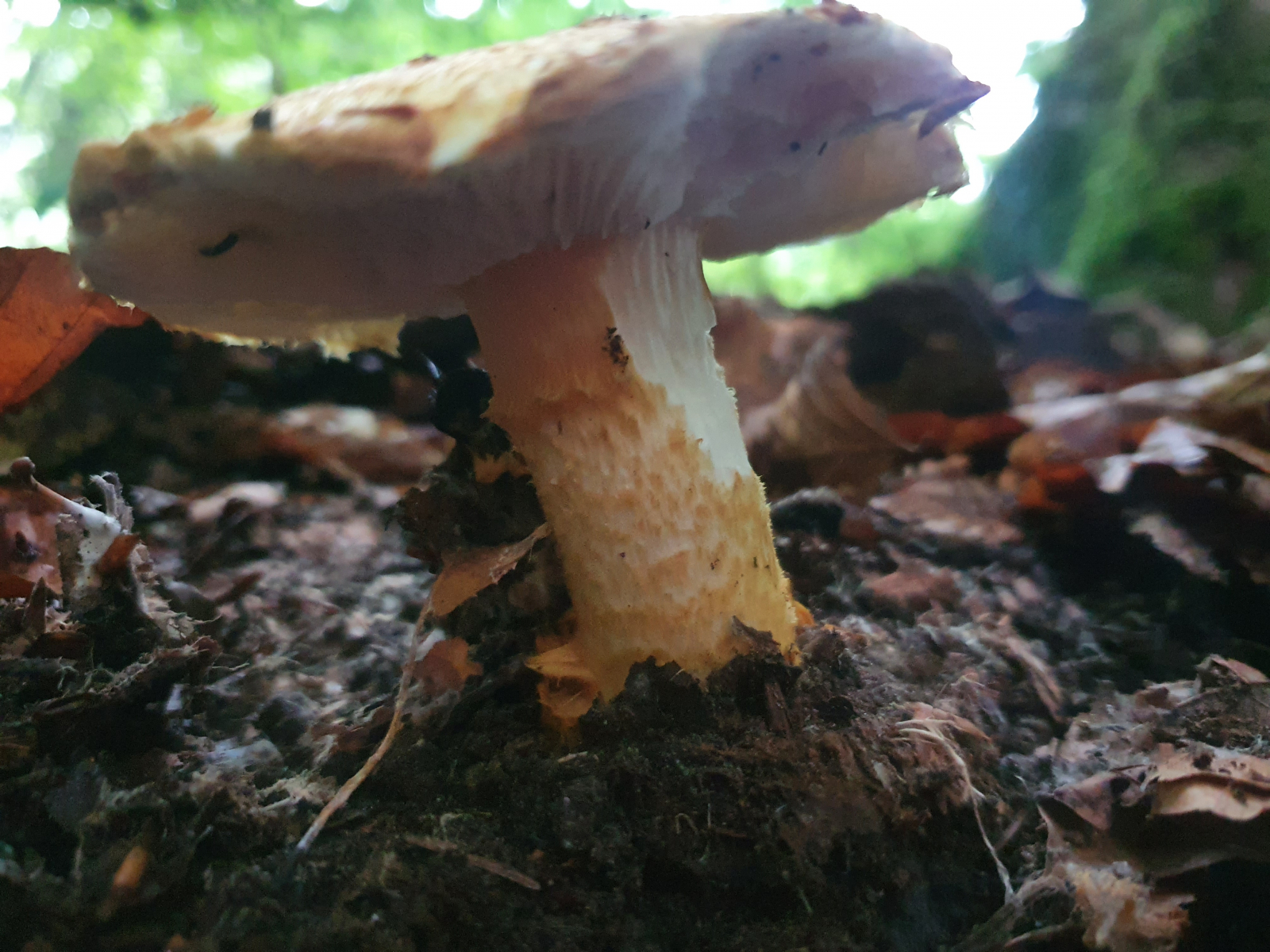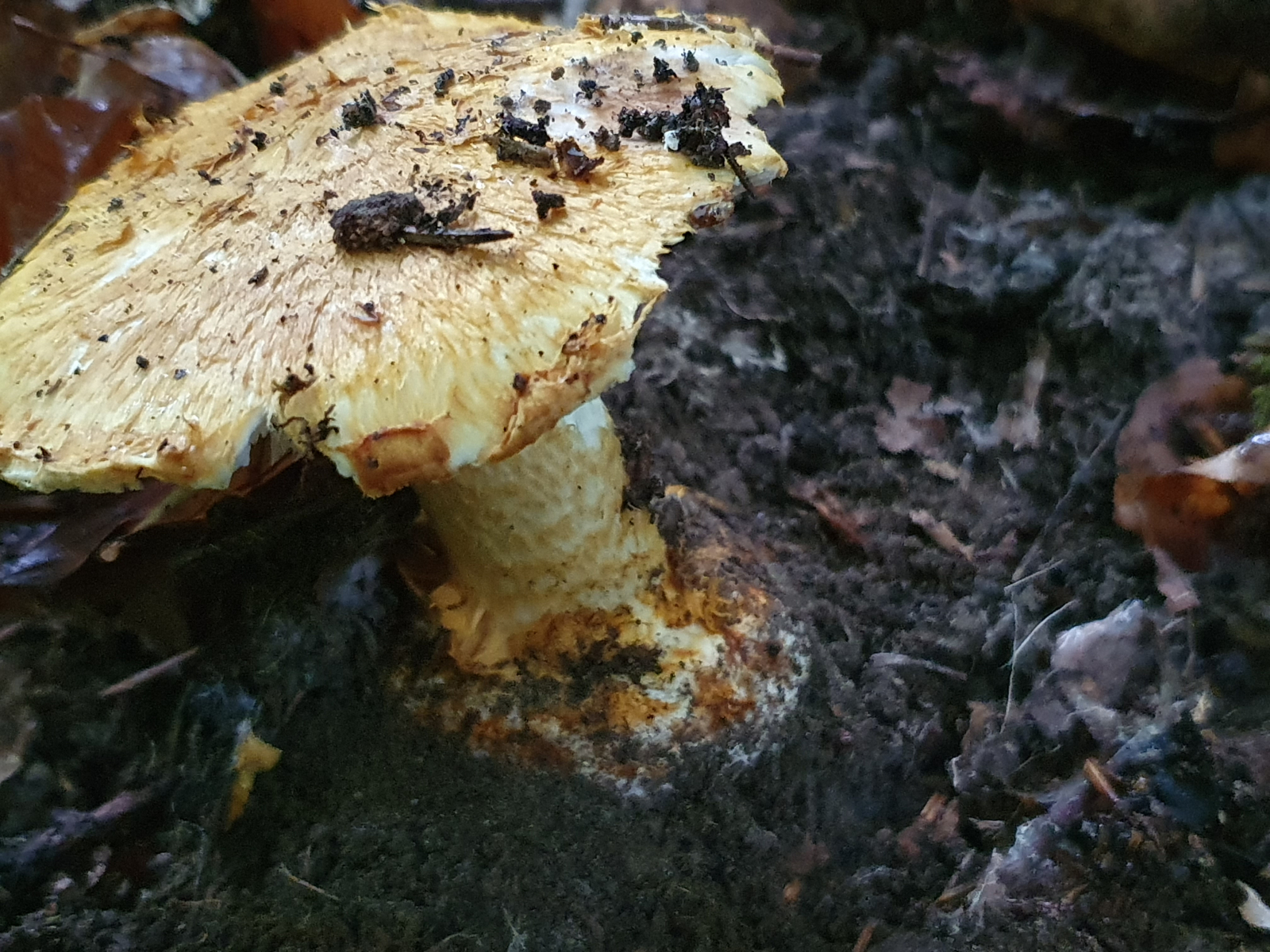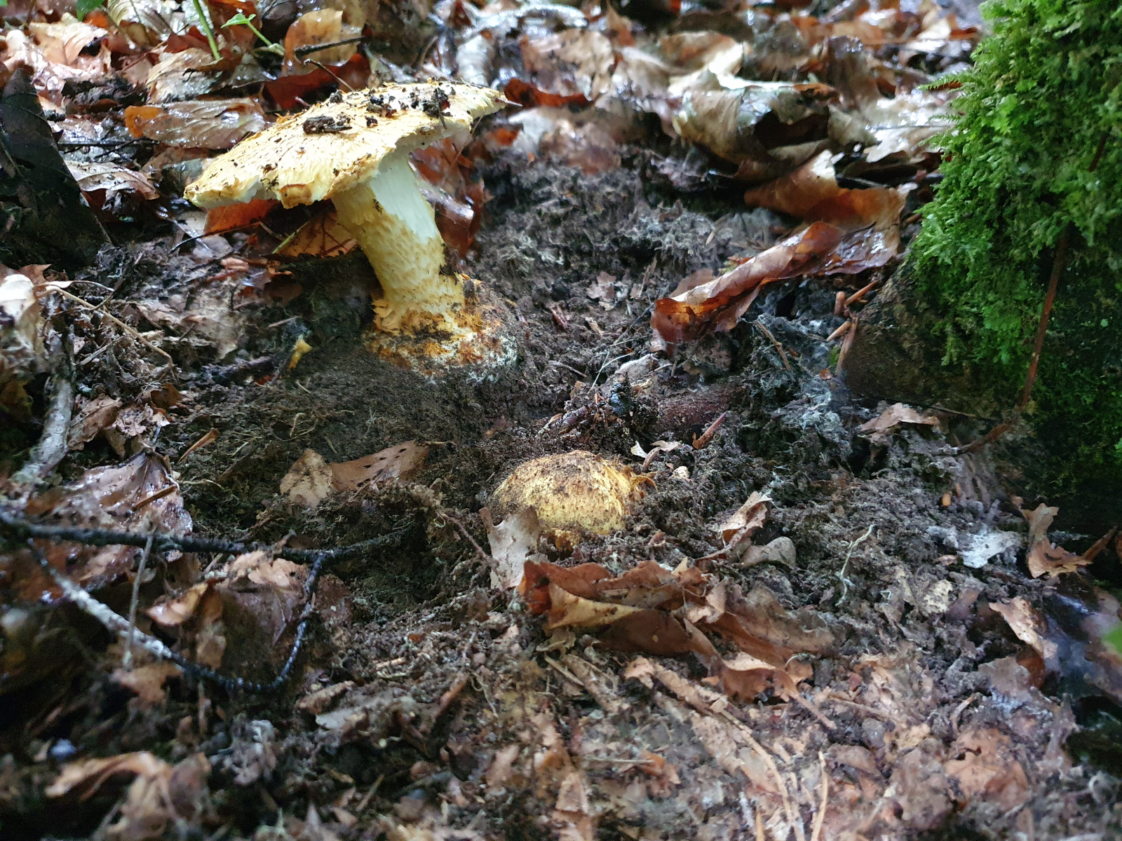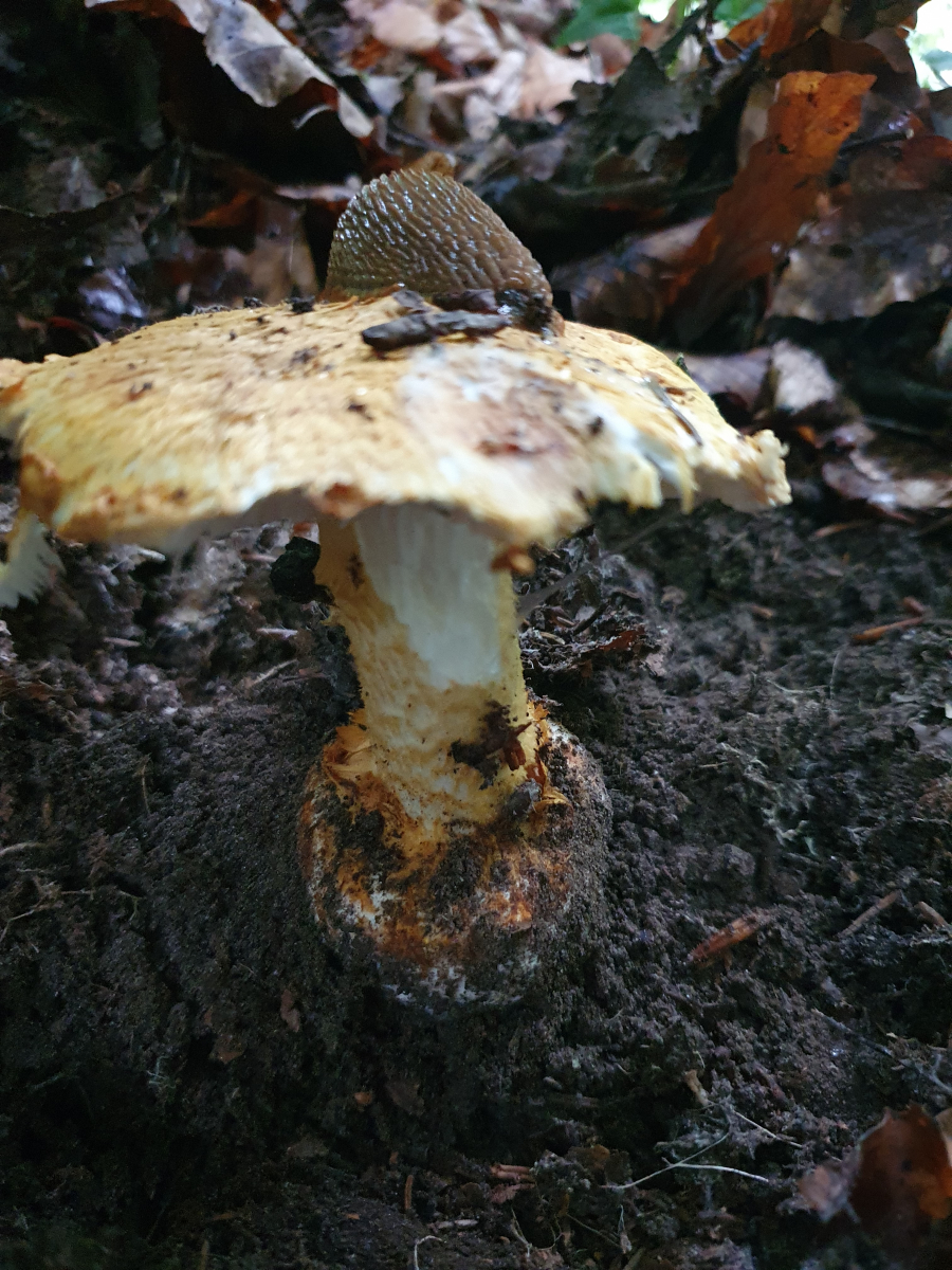 ) erfolglosen Stellen rief mich ein guter Kollege an. Wir sprachen ein wenig über die vergangenen Ferien und dies und das. Nach dem Auflegen bin ich zwei drei Meter weitergegangen, sah einen weiteren Wulstling und ca ein halber Meter dahinter erschien ein strohgoldener Hut eines Pilzes. Sofort dachte ich, tatsächlich einen gefunden zu haben! Aber konnte das sein?