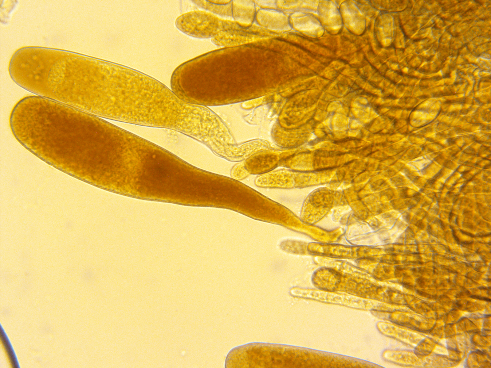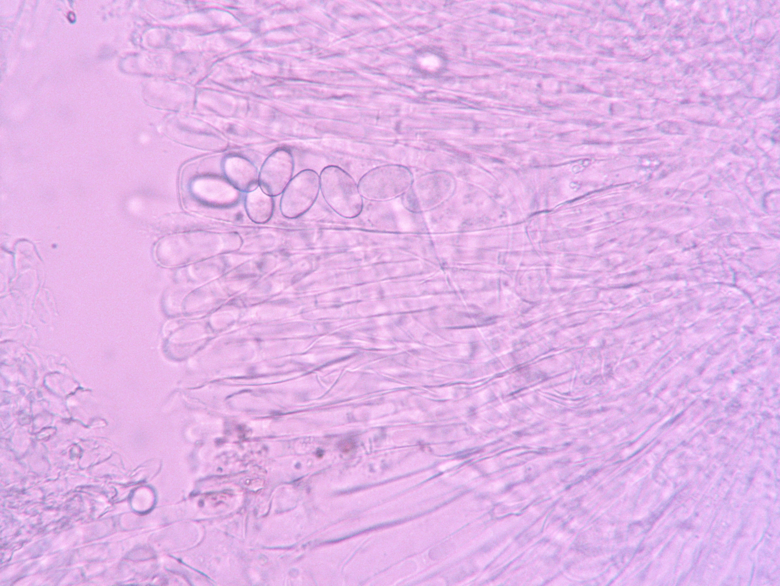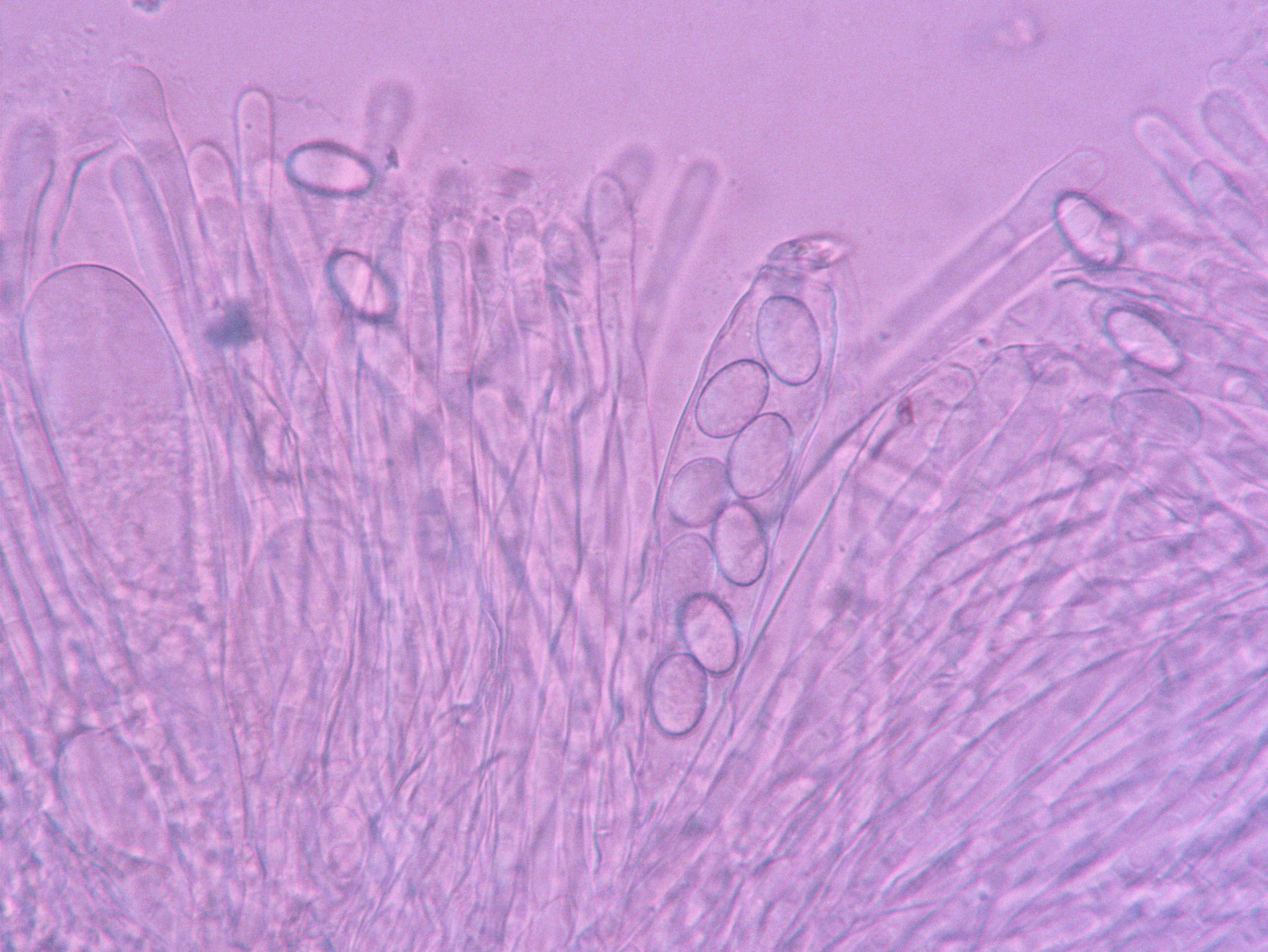 auf unserer Fachgruppenexkursion in den Sebnitzer Stadtwald hatte ich unter anderem Wildschweinköttel mitgenommen. Nach fast zwei Wochen sprießen da jetzt kleine weiße Becherchen, die, wenn sie älter werden, sich etwas rosa verfärben. Die gehen dann auch ineinander über, so als würden sie miteinander verwachsen. Jodreaktion ist positiv und die Sporen sind 17,89 bis 20 x 9,19 bis 10,82 µm. Sie sind leicht warzig. Die Paraphysen sind septiert.
