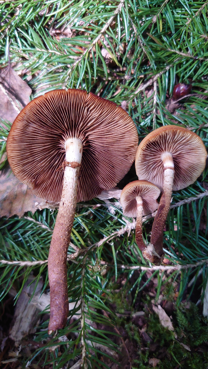 Beim nächsten kann ich leider nur raten, könnte das vielleicht ein Rotschuppiger Raukopf sein? Gefunden am Fuße einer Fichte.
