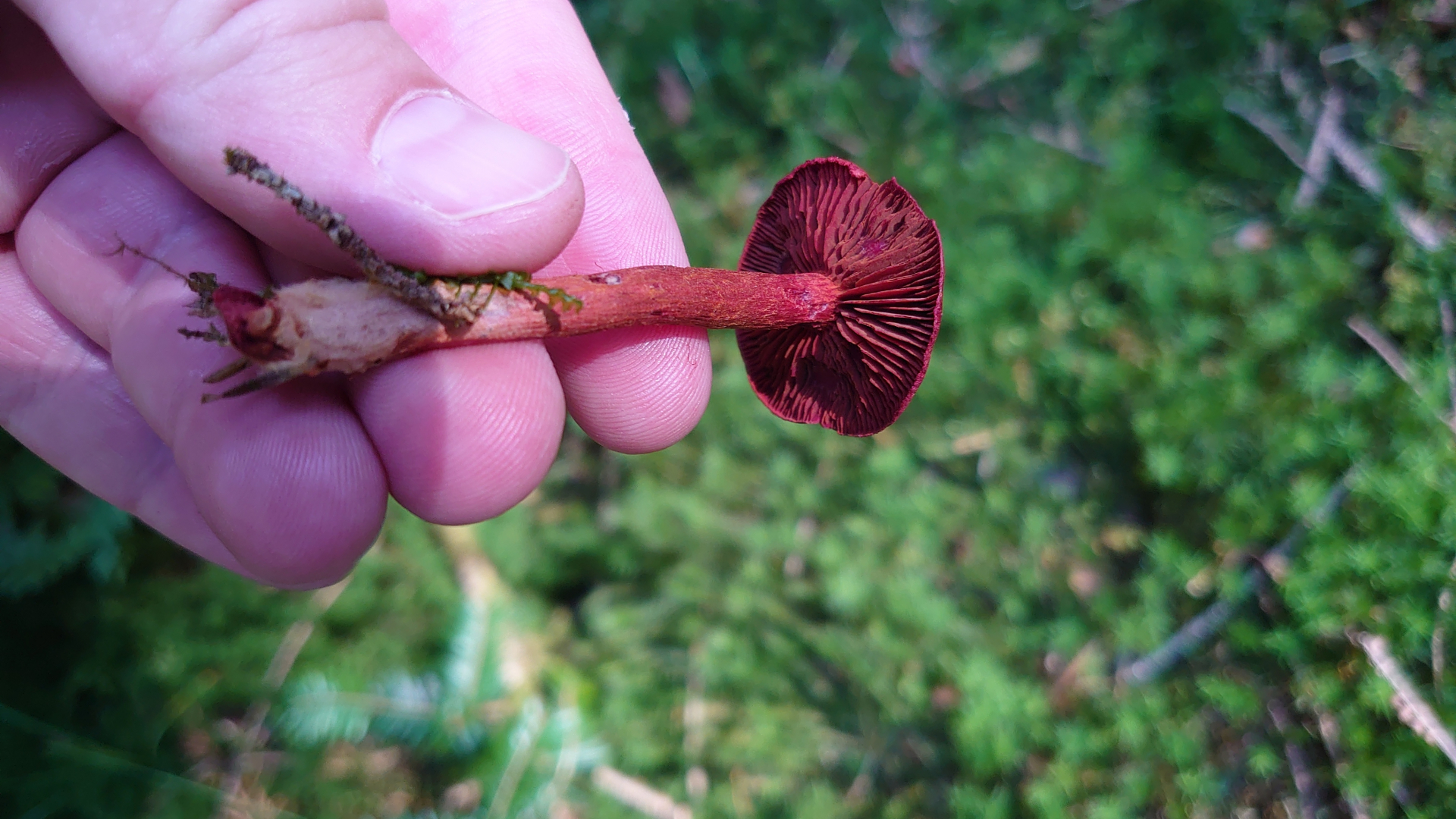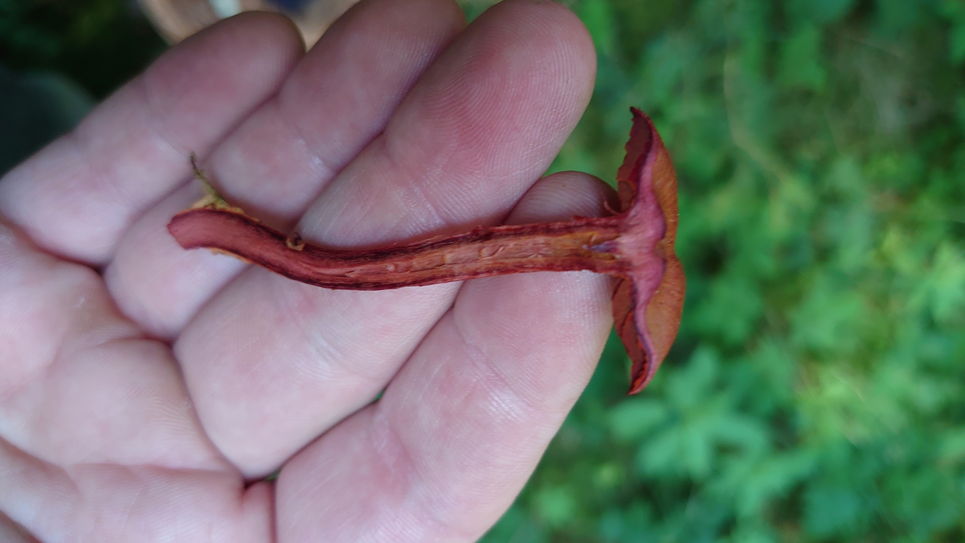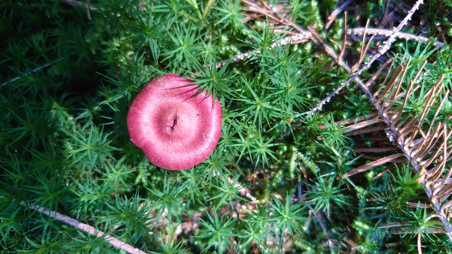 Des weiteren habe ich einen gefunden, bei dem ich glaube, dass es ein violetter Lacktrichterling ist. Leider lügen die Bilder etwas, denn so knallig lila war er nicht, eher so wie auf der Ansicht auf den Hut von oben, also eher ins rötliche.