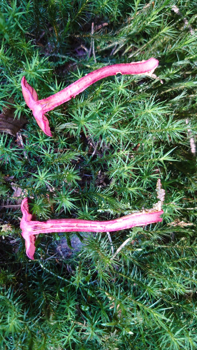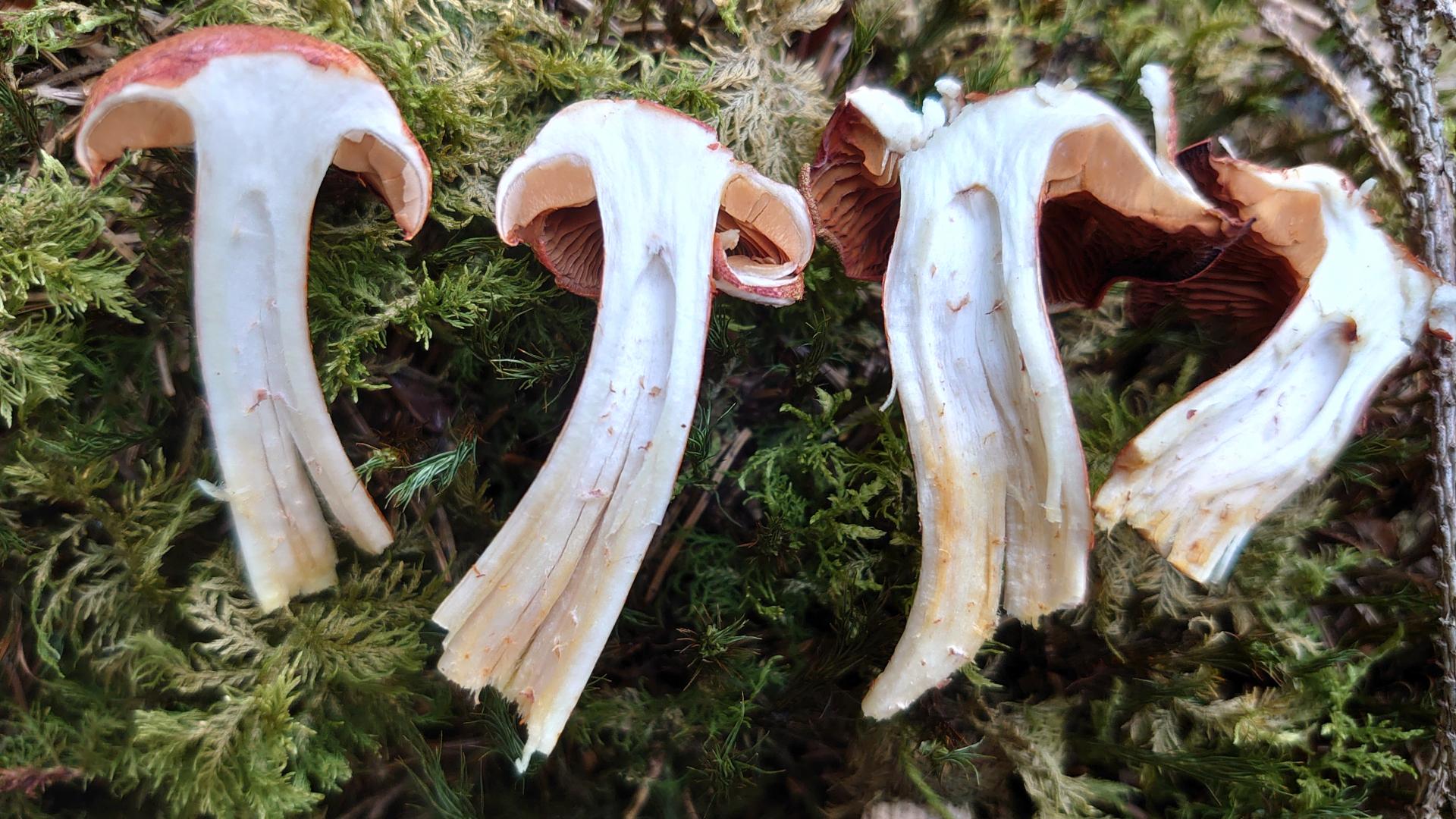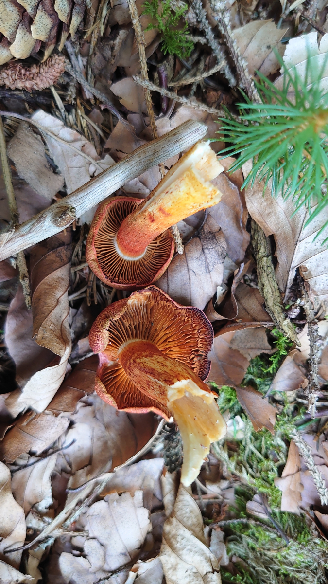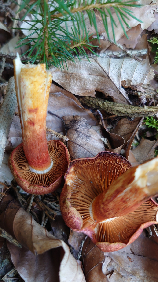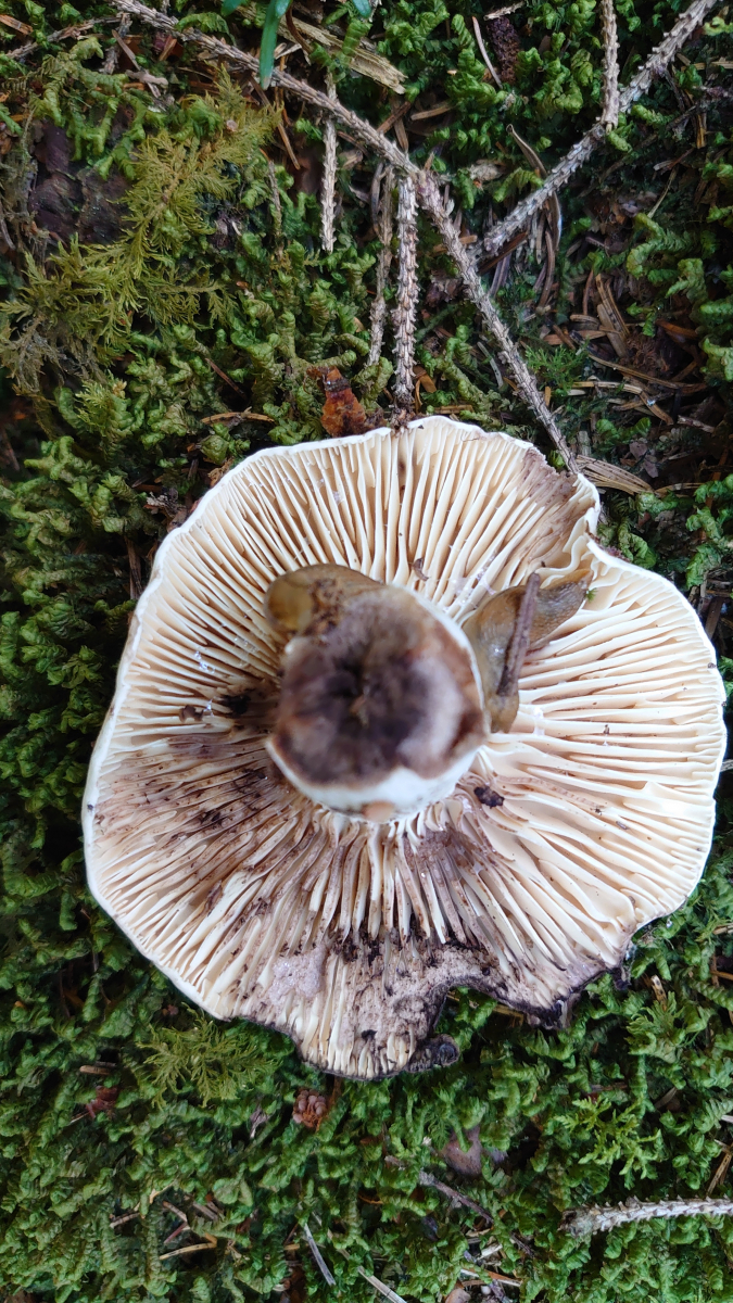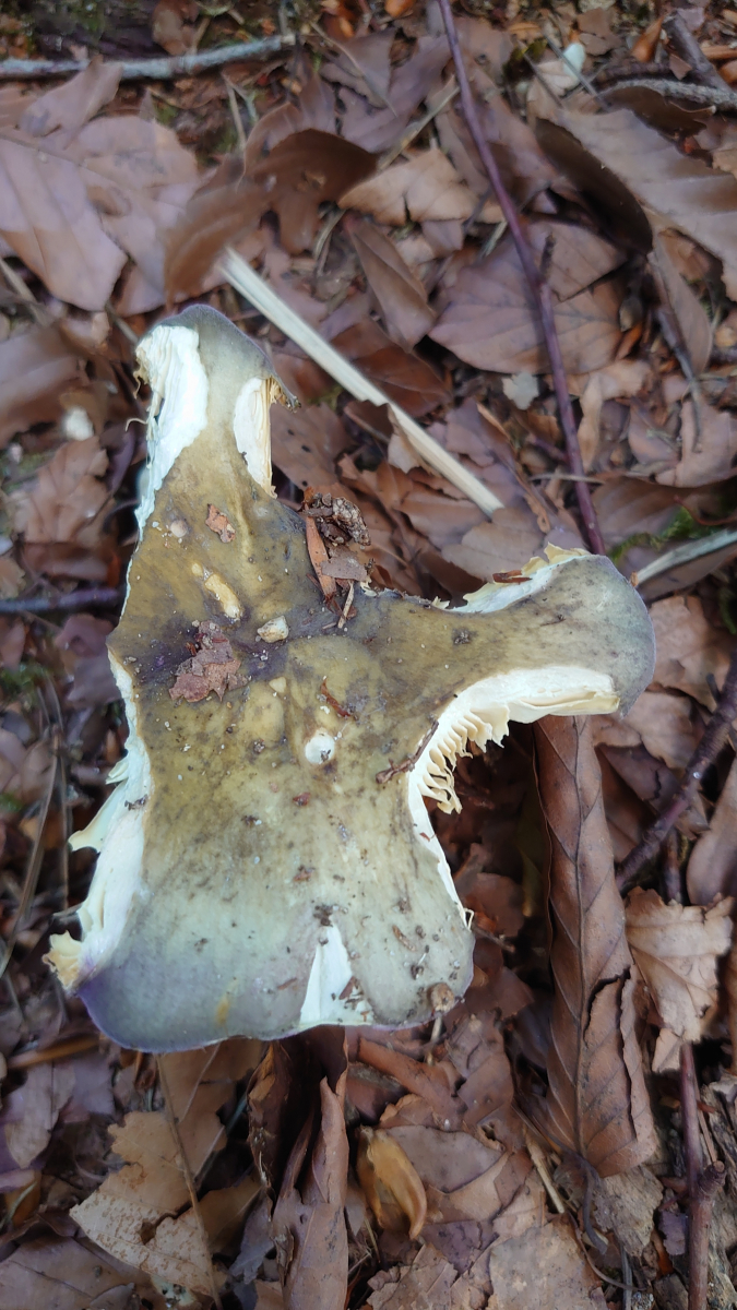 Meine Schätzung hier wären Papageientäubling (hier habe ich leider nicht mal die Ansicht von unten, aber die Lamellen waren weiß) und Dickblättriger Schwarztäubling. Vielleicht sind die Merkmale hier ja so markant, dass eine Makroskopische Bestimmung möglich ist.