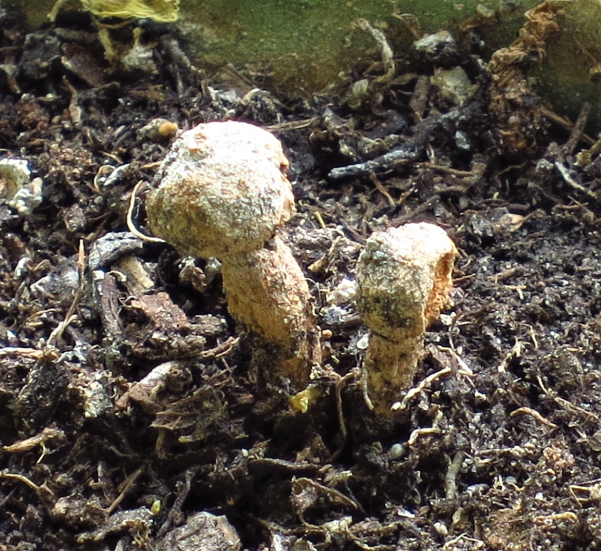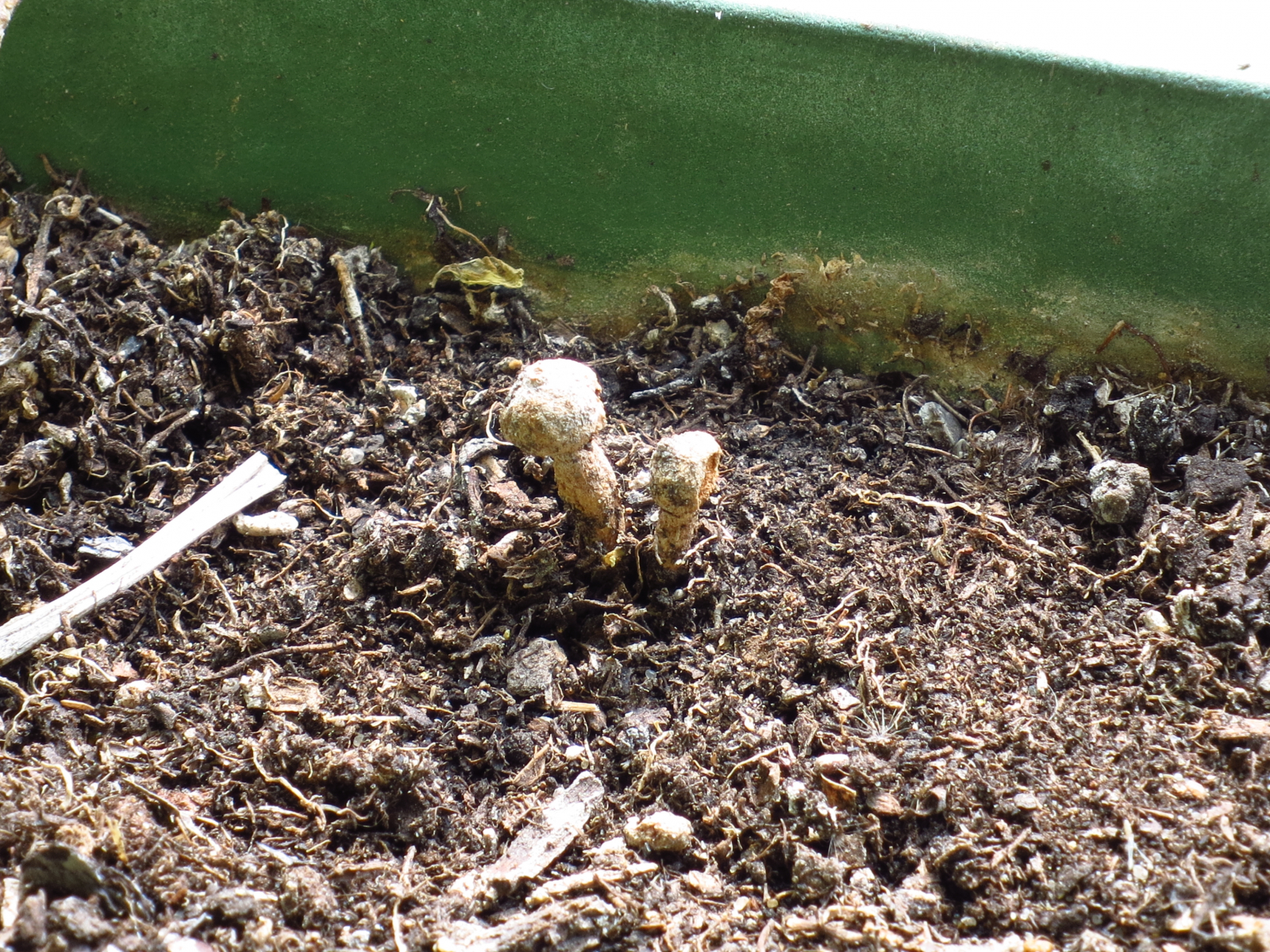 vielen Dank für Deine Mühe!==Gnolm8 Zu den Sporen kann ich natürlich nichts sagen, aber ich habe noch zwei zusätzliche Informationen, die den Tulostoma-Experten eventuell weiterhelfen könnten. Erstens die Myzelfäden sind weiß und zweitens FK ohne Sonnenschäden, sehen nicht viel anders aus. Ich habe noch drei weitere FK unter meiner Petersilie entdeckt. Einen so zeitig, dass ich ihm einen wirksamen Sonnenschutz basteln konnte. Der drei Tage alte FK ist trotzdem nur 3cm groß, die scheinen so klein zu bleiben.