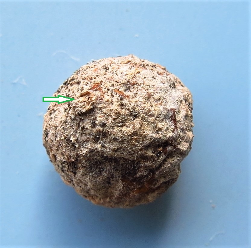 Von oben, der Pfeil zeigt auf die Sporenöffnung