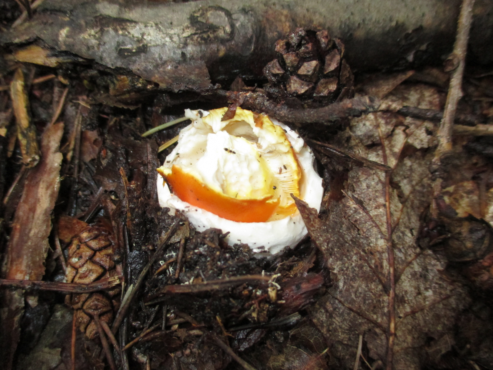 Der orange Hut, die gelben Lamellen, die weiße Gesamthülle, einfach einzigartig!