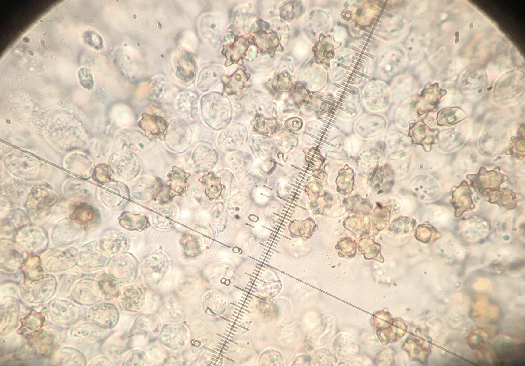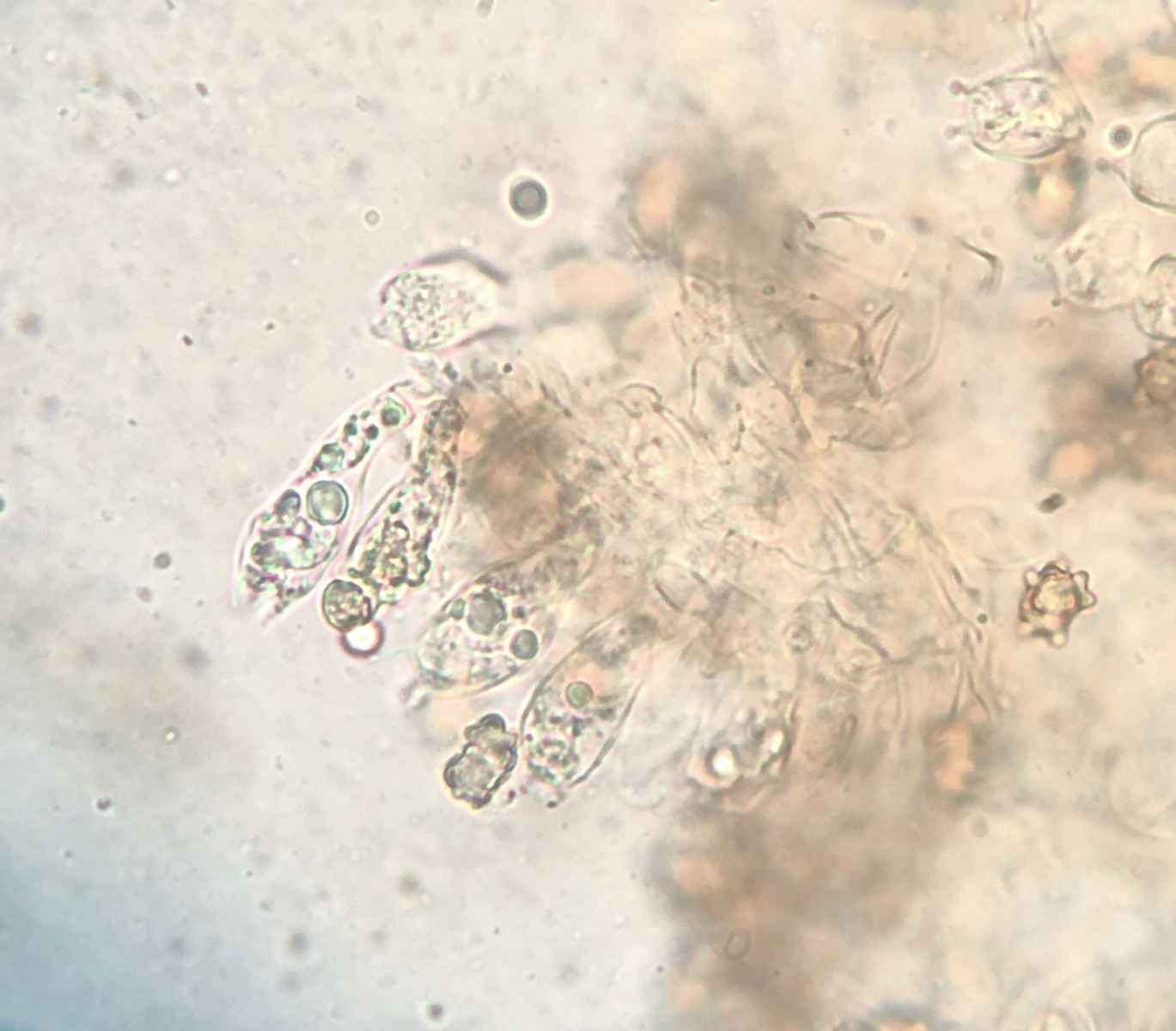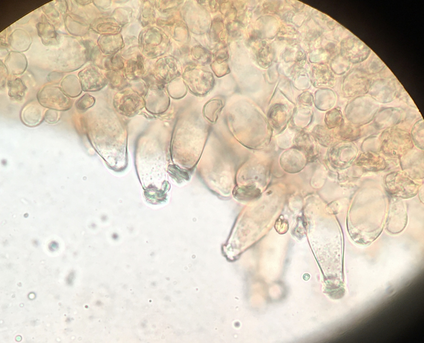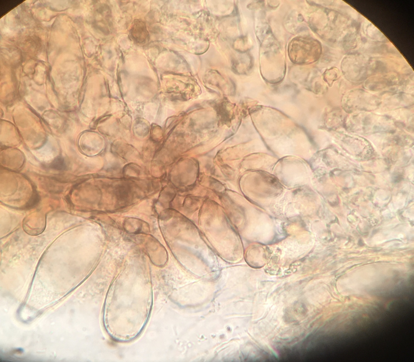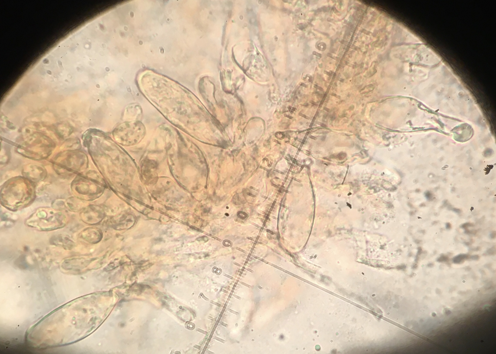 heute habe ich mir wieder mal eine Inocybe mitgenommen, da ich sie recht auffällig finde. Sie wuchs auf einem schon zerfallenden Nadelholzstumpf, sah aus als würde sie an Holz wachsen. Die erste Idee I. lacera passt leider nicht, die Sporen haben eine andere Form. Sie messen 8-9 x 5-6.