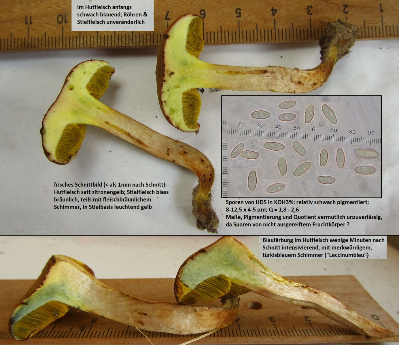 Wegen dem leuchten gelben Fleisch unten in der Stielbasis kam mir am Fundort der Gedanke an Xerocomus chrysonemus. Dagegen spricht aber das erst getrocknet blass ockergelbe Basismycel, beim Frischmaterial war es eher cremefarben. Auch sollte X. chrysonemus ein Pilz mit recht kurzen & breiten Sporen sein. Erst recht, wenn ich hier davon ausgehe, daß die Sporen von einem nicht ausgereiften Fruchtkörper stammen, dürfte der Quotient hierfür eigentlich schon aus dem Rahmen sein.