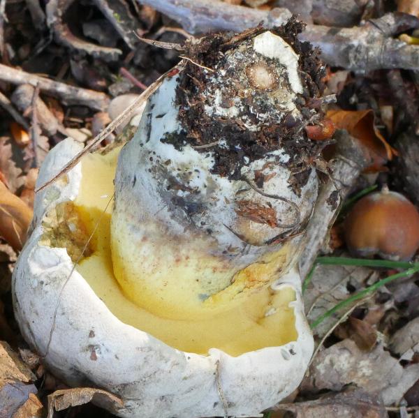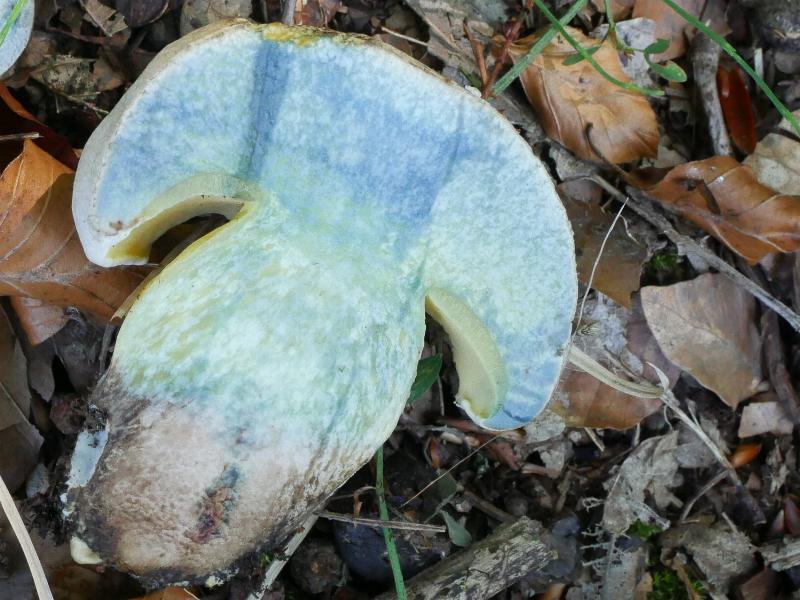 Ich nehme an , dass es sich um den Wurzelnden Bitterröhrling Caloboletus radicans handelt , aber so ganz sicher bin ich nicht.