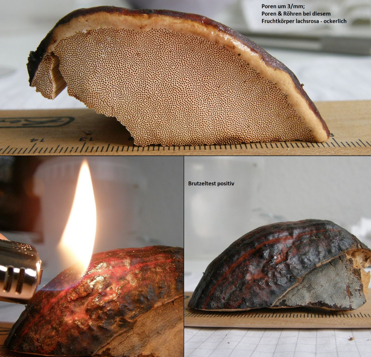 Wenn man irgednwo ein Stück Hutkruste findet, hilft der Brutzeltest. Weil Hutkruste von FomRosi ohne Harzeinlagerung (schwelt nur beim Anzündeln) und bei FomPini mit Harz (schmurgelt und blubbert beim Anzünden).