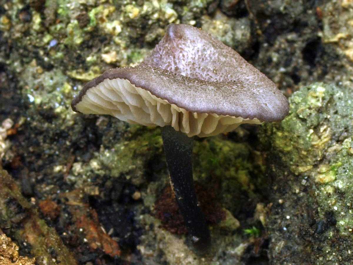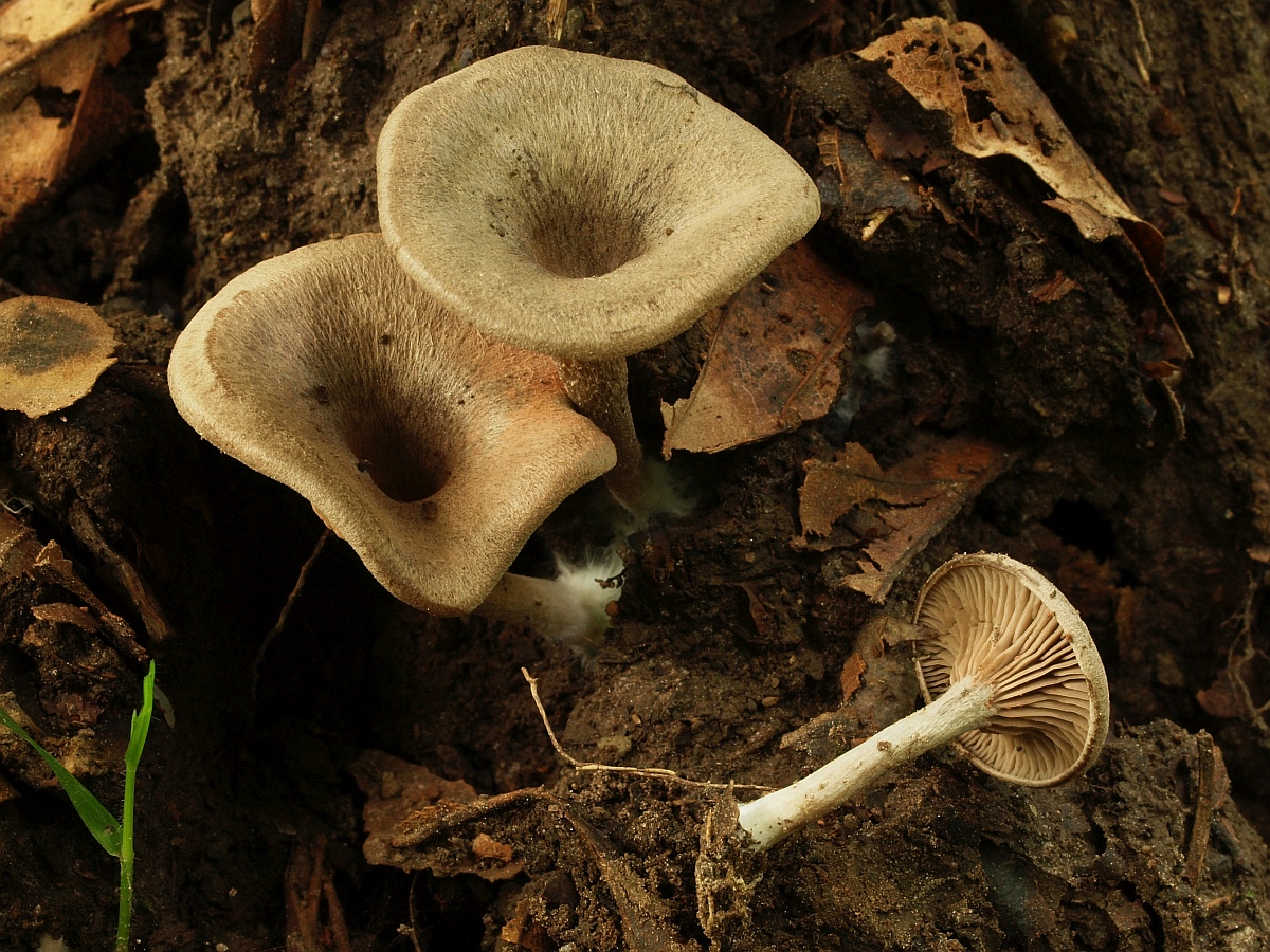 Gleich zu Beginn fanden wir zwei Rötlinge mit Trichterlingshabitus. Nummer eins hat in jungem Zustand einen blauen Stiel und einen Hut mit grau- bis lilablauen Farben, welche rasch verschwinden.