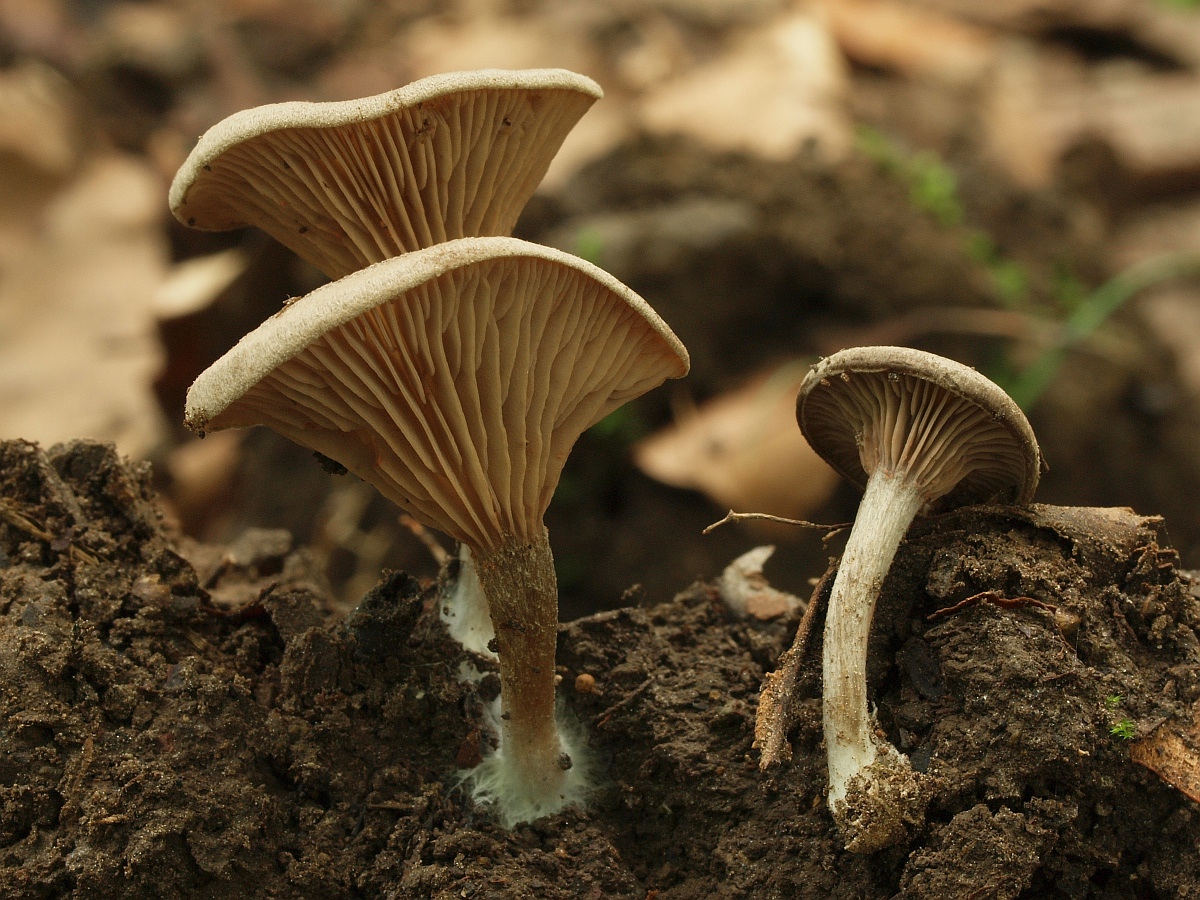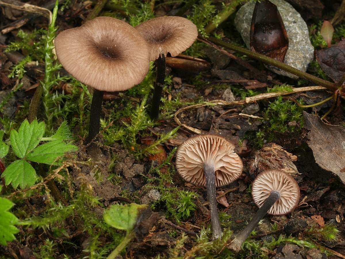 Gleich zu Beginn fanden wir zwei Rötlinge mit Trichterlingshabitus. Nummer eins hat in jungem Zustand einen blauen Stiel und einen Hut mit grau- bis lilablauen Farben, welche rasch verschwinden.