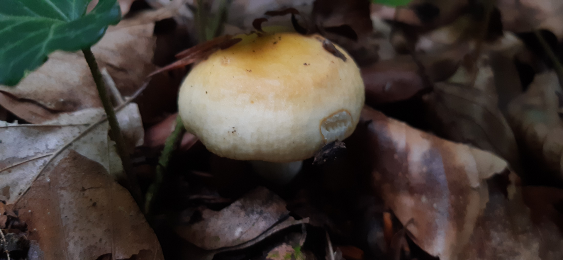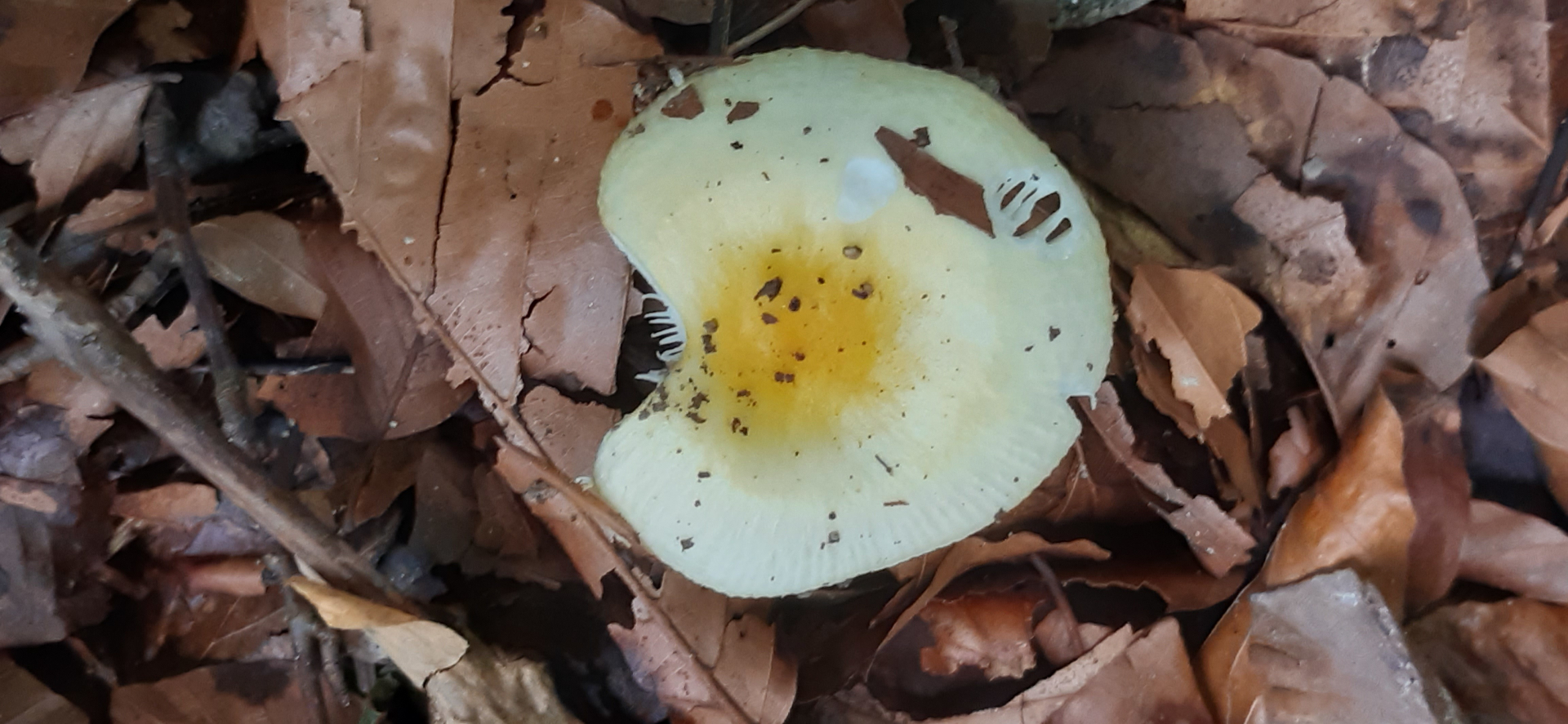 Zum Schluss noch ein Täubling, den ich vor einiger Zeit schon mal in irgendeinem Thread gesehen hatte. Damals fand ich ihn schon wunderschön und erkannte ihn sogleich an der kräftig gelben Farbe in der Hutmitte und dem starken Ausblassen zum Hutrand hin sofort wieder.