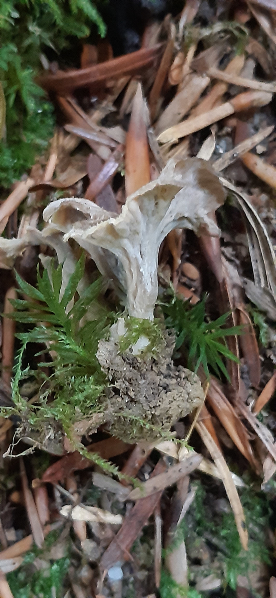 Dann fiel mein Blick plötzlich auf kleine graue Pilzchen im Moos. Auf der Hutunterseite waren wenige Leisten mehr oder weniger nur angedeutet. Bestimmt wurden sie von mir als Krause Kraterelle (Pseudocraterellus undulatus (*)). Ich bitte die miese Qualität des Bildes zu entschuldigen.