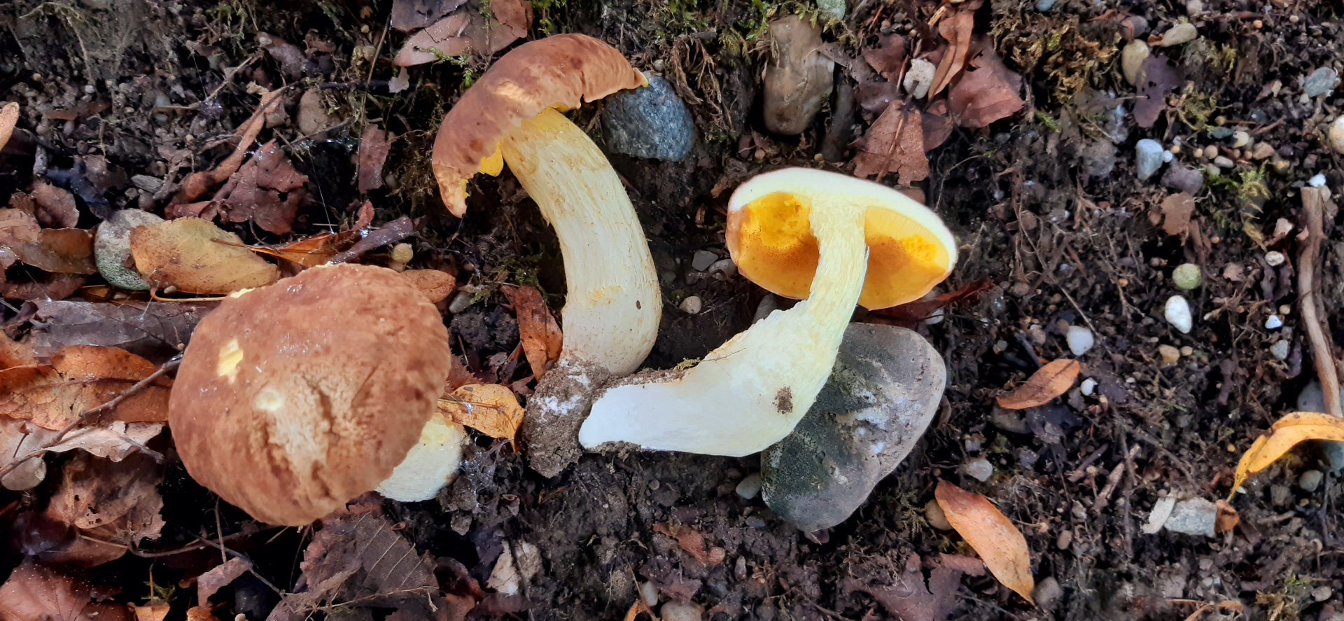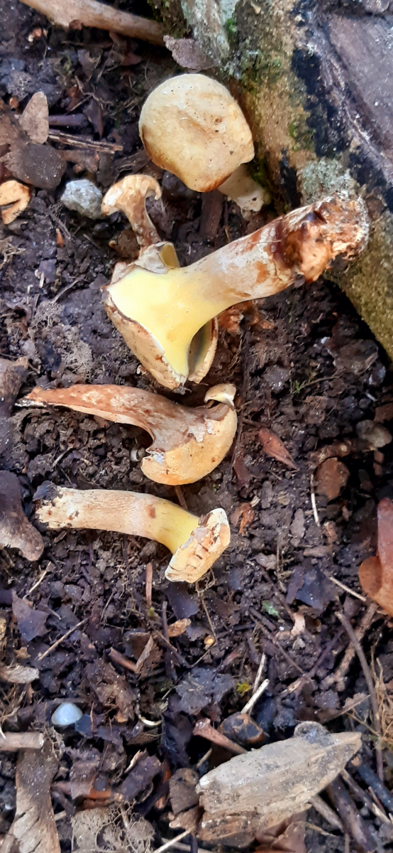 Nur wenige Meter weiter stand eine Gruppe, die ich von oben erst für etwas komisch gewachsene Brennende Rüblinge (Gymnopus peronatus) hielt. Einen Pilz entnommen und umgedreht, schon erkannte ich Erlengrüblinge (Gyrodon lividus (*)).