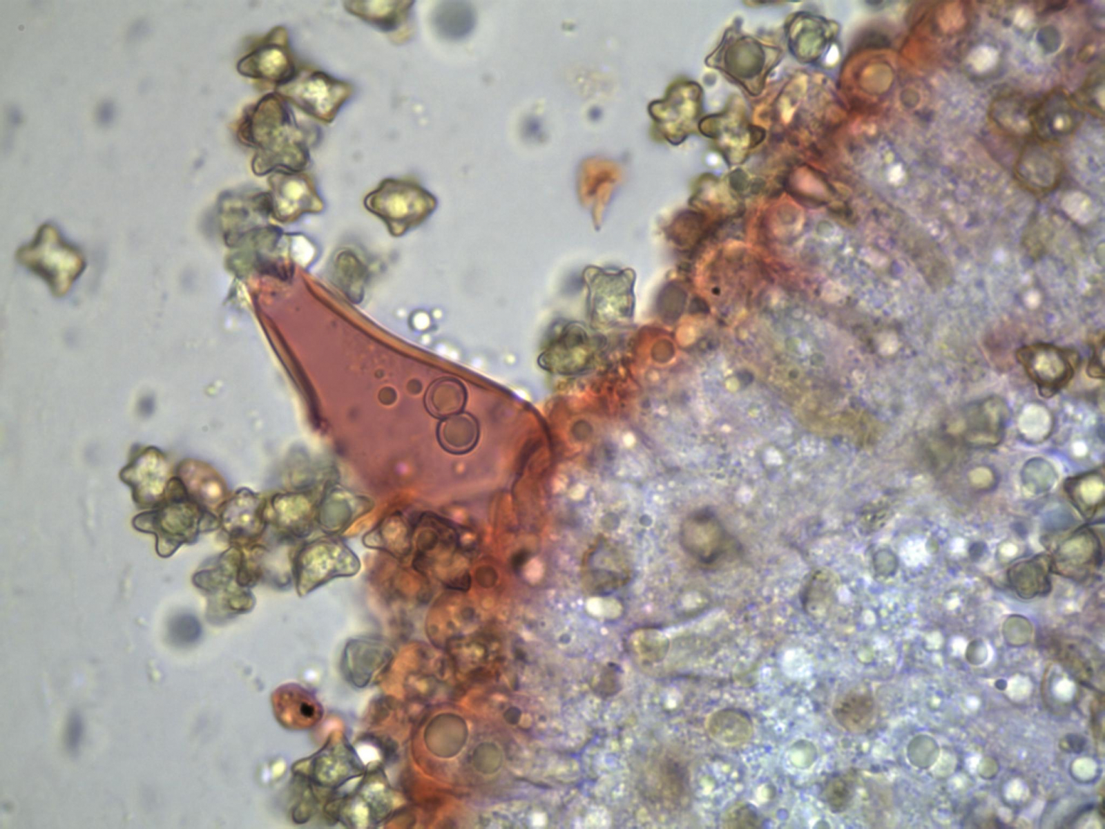 Zystiden: spindelförmig mit Kristallschopf, dickwandig; 60.3 × 25 µm