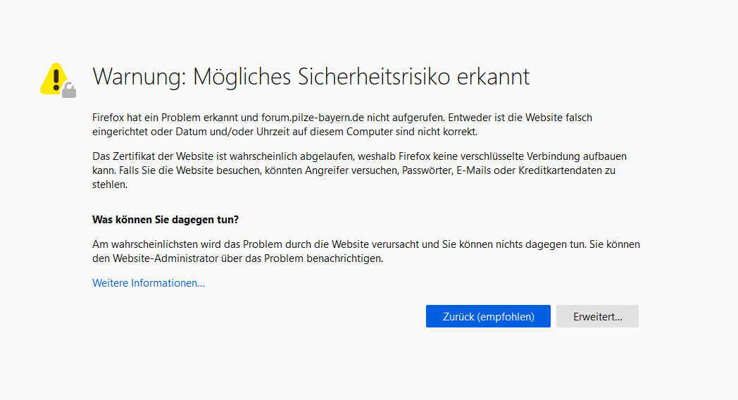 wenn ich das Forum der Bayerischen Mykologischen Gesellschaft aufrufen möchte, bekomme ich die Meldung, dass keine sichere Verbindung hergestellt werden kann. Weiß jemand, was da los ist, zum Beispiel Tricholomopsis ?