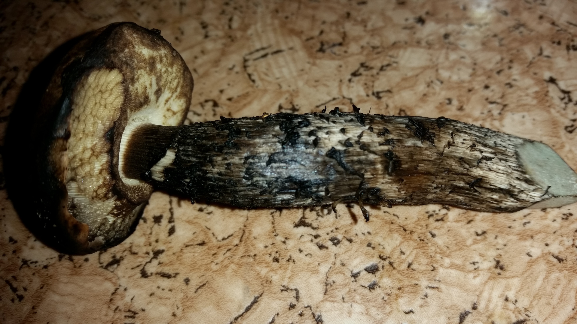 Der Hainbuchenröhrling ist auch sehr jung und nach dem Abschneiden schwarz geworden. Trotzdem noch schön fest. Schneckenfraß macht mir nichts aus, kann man ja wenns einen stört wegschneiden.