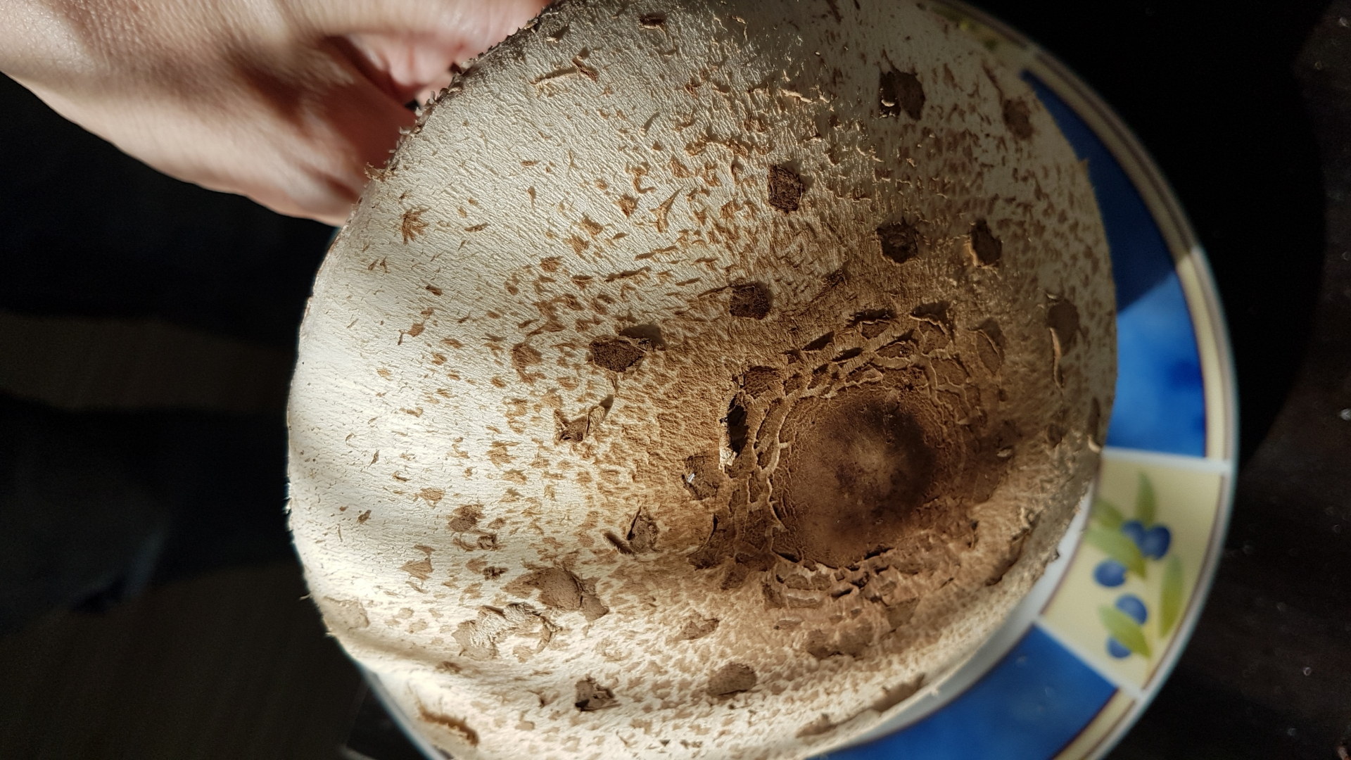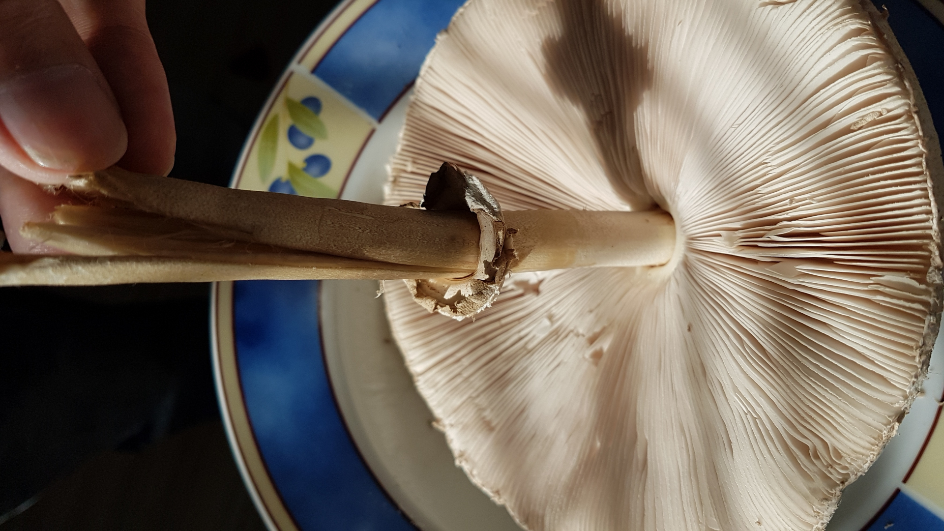Auf dem zweiten Bild kann ich eine leichte Natterung auf dem Stiel erkennen, die zwar schwächer ausgeprägt ist als beim Parasol, aber vorhanden. Die giftigen oder unverträglichen Riesenschirmlinge, die mir bekannt sin, besitzen alle einen gänzlich ungenatterten Stiel (giftig sind der Gerandetknollige Safranschirmling - rötet im Schnitt, abgesetzte Knolle; der Grünsporige Riesenschirmling - im Alter ein Grünstich in den Lamellen; individuell unverträglich wohl der Jungfernschirmling und der Keulenstielige Safranschirmling). Mit Natterung auf dem Stiel und verschiebbarem, wolligem Ring sind mir keine giftigen Arten bekannt.