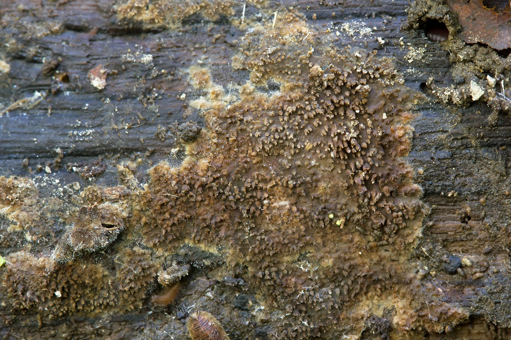 Falls aber nicht nur mit inkrustierten Hyphidien an den Zähnchenspitzen, sondern auch im Hymenium darunter mit inkrustierten lamprozystiden, dann wär's >Phlebia nothofagi< (wäre deutlich häufiger als Phlebia fuscoatra).LG; Pablo.