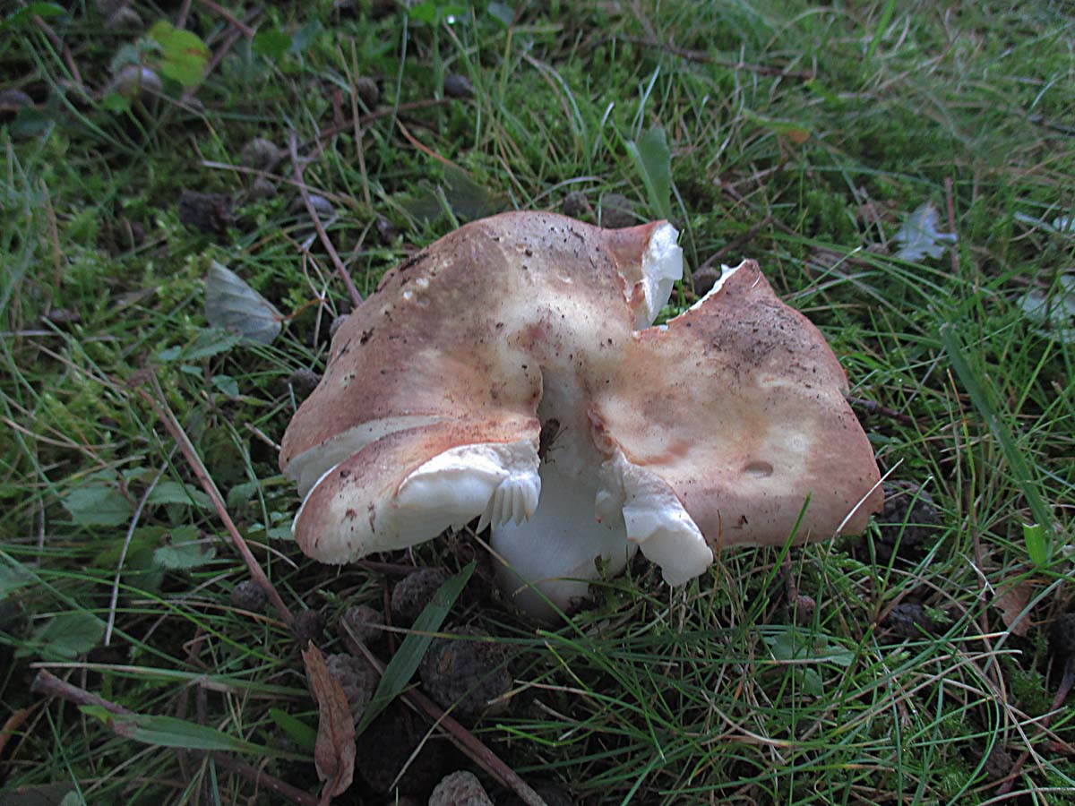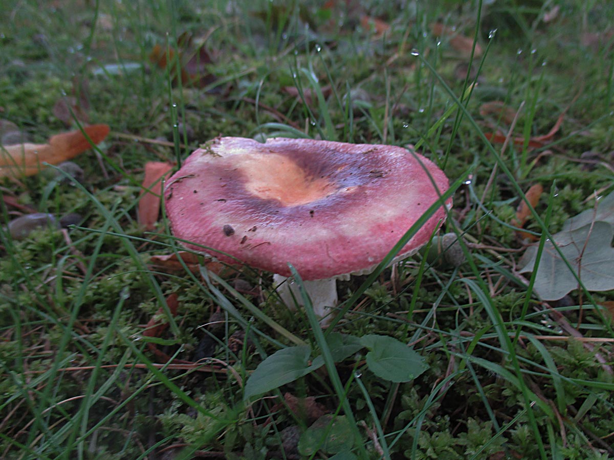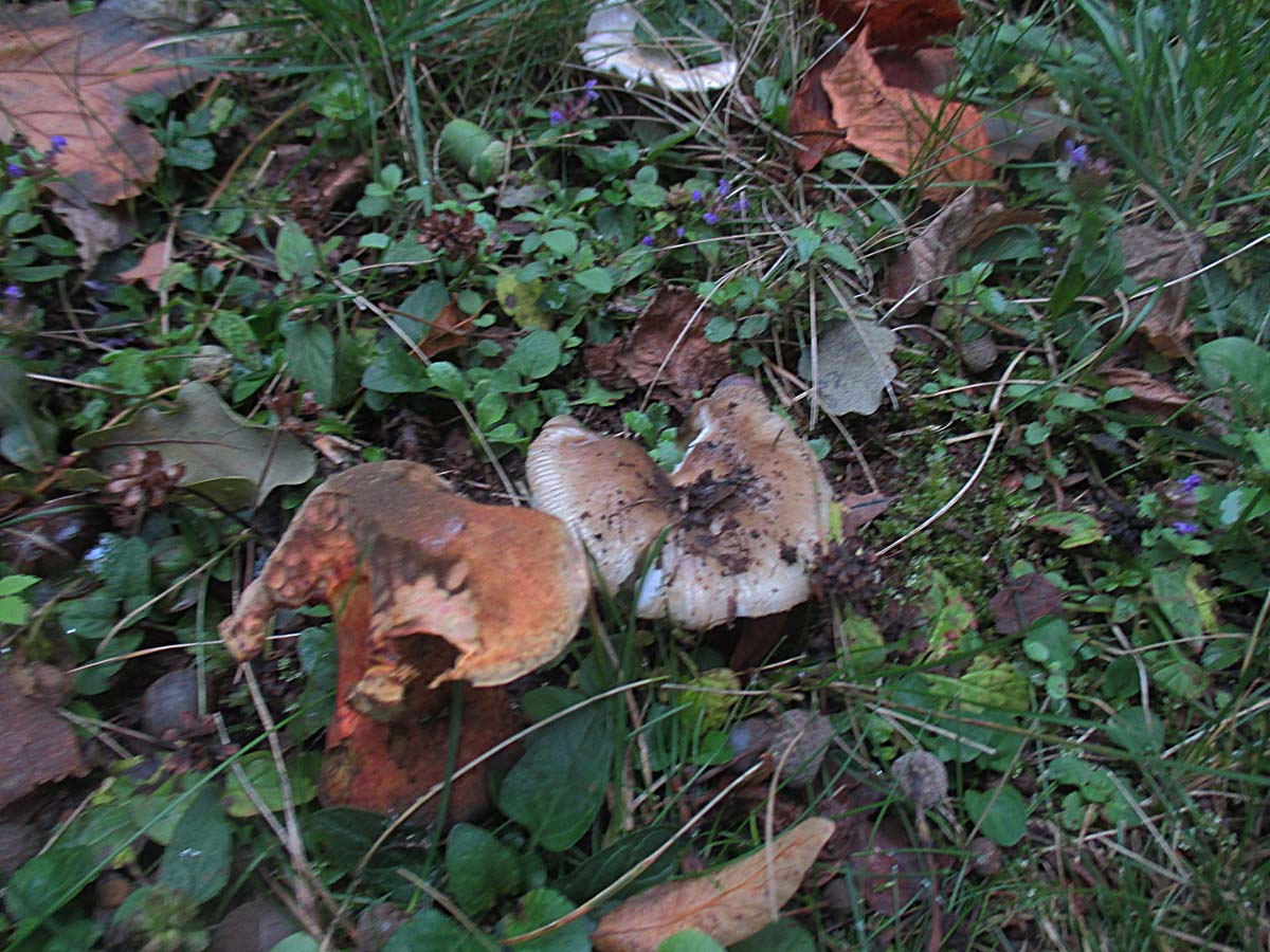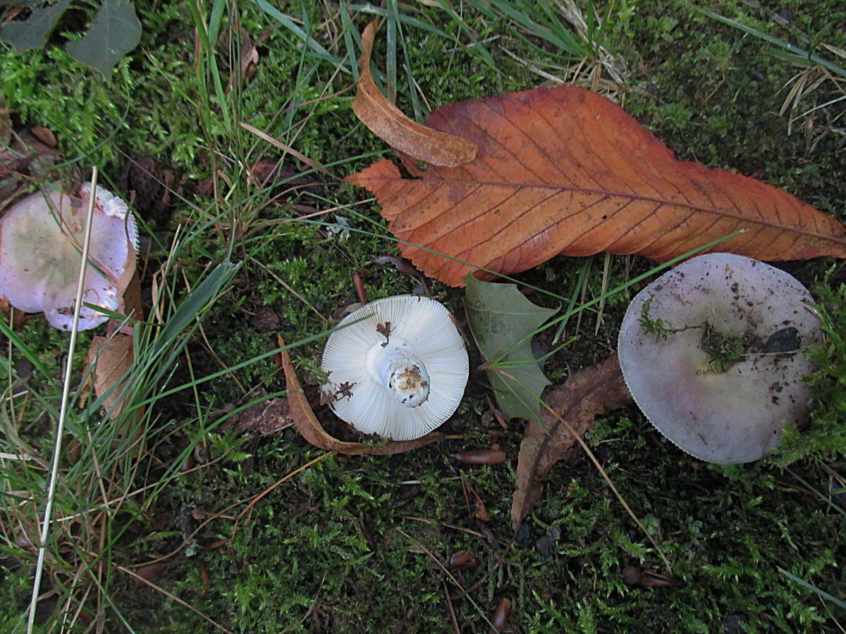 Einige Täublinge gab es auch wie den Papageientäubling (Russula ionochlora), einen vermutlichen Fleischvioletten Heringstäubling (Russula graveolens) und den Kratzenden Kammtäubling (Russula recondita), hier zusammen mit einer angefressenen Netzhexe.