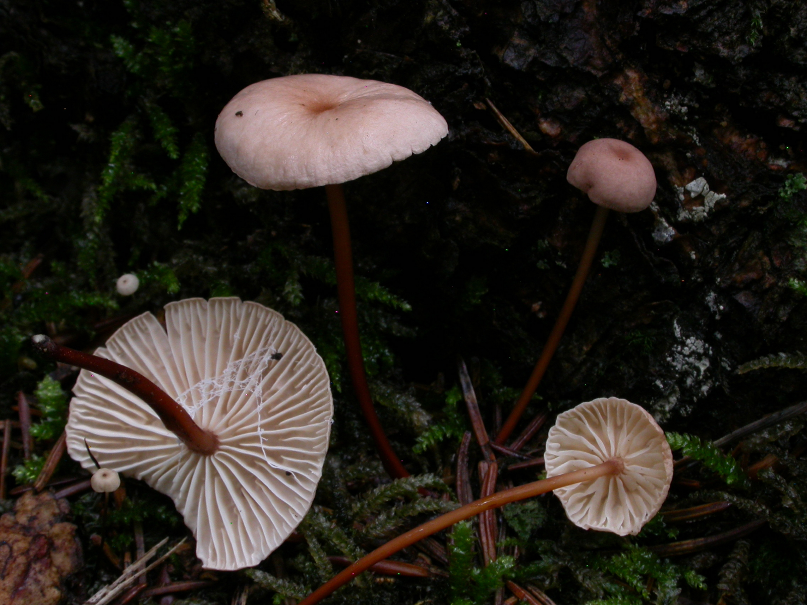 In der Nadelstreu Marasmius scorodonius, Echter Knoblauchschwindling, mit dem typischen Rosatouch am Hut.