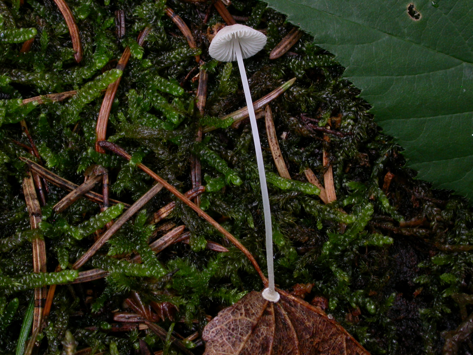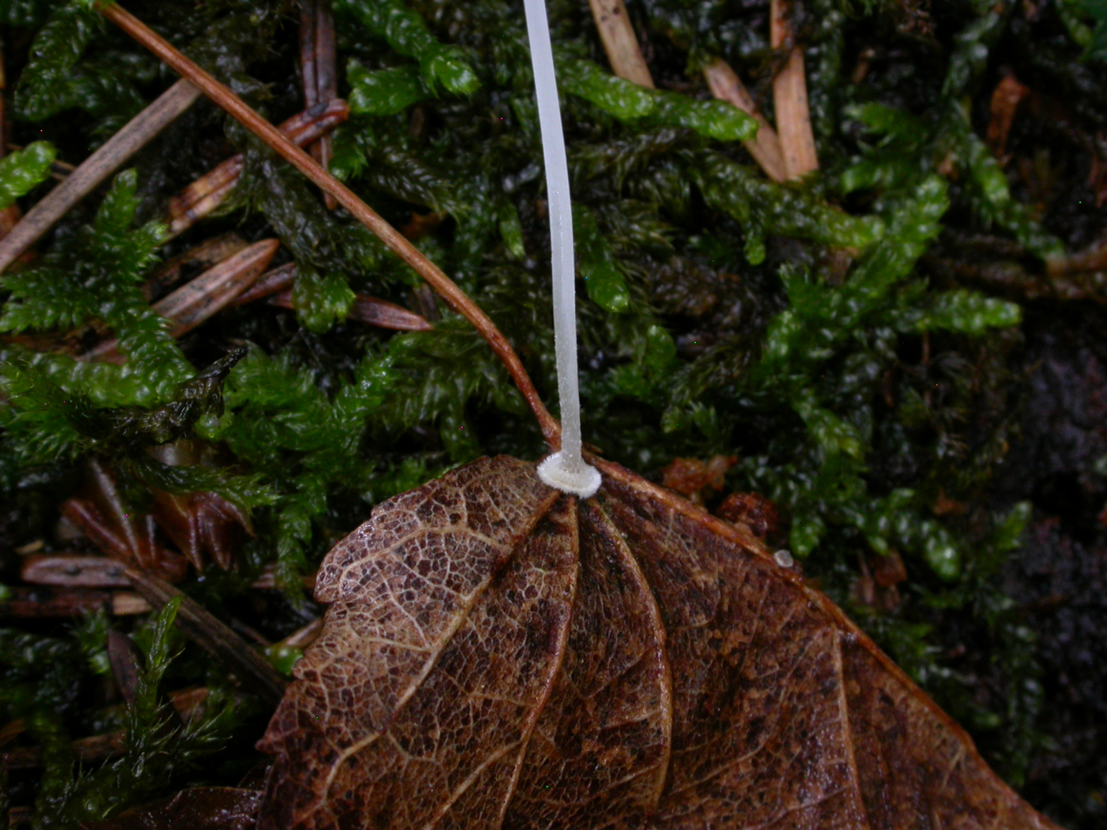 Mycena stylobates, Postamenthelmling. Ein kleiner grauweißer Helmling mit Basalscheibchen meist einzeln an Blättern, hier ein Lindenblatt.