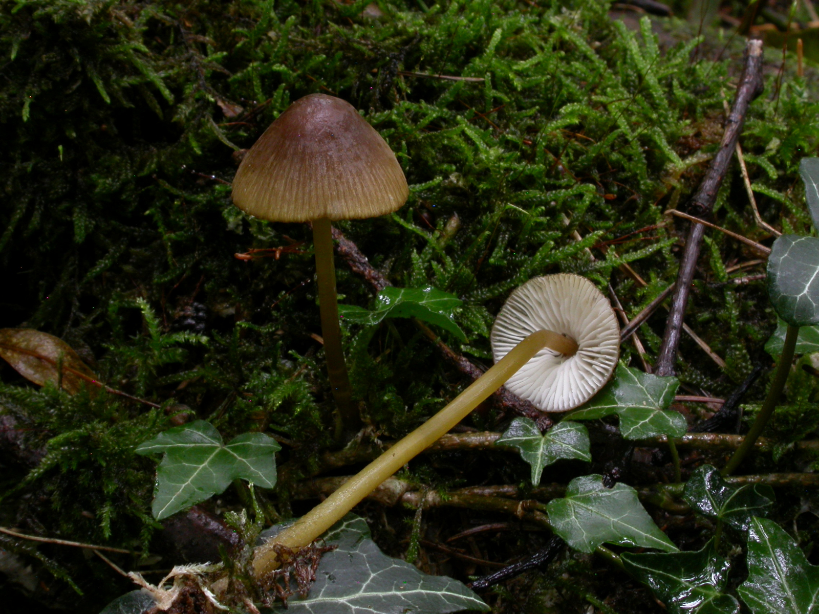 Zuerst Mycena viridimarginata, Grünschneidiger Helmling. Nach Schwimmbad riechend und Nadelholz besiedelnd. Zusammen mit den olivgelben Farben an Hut und