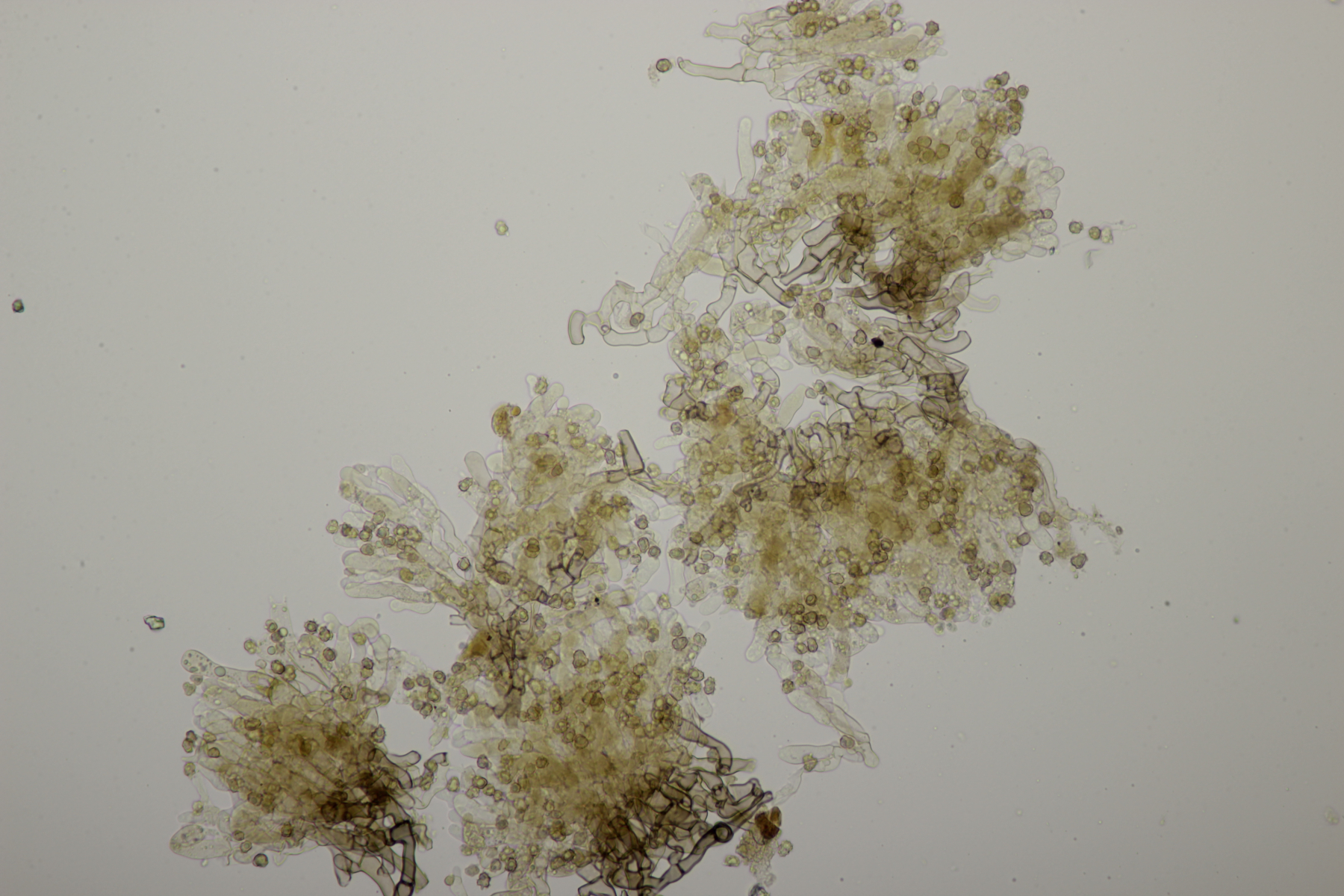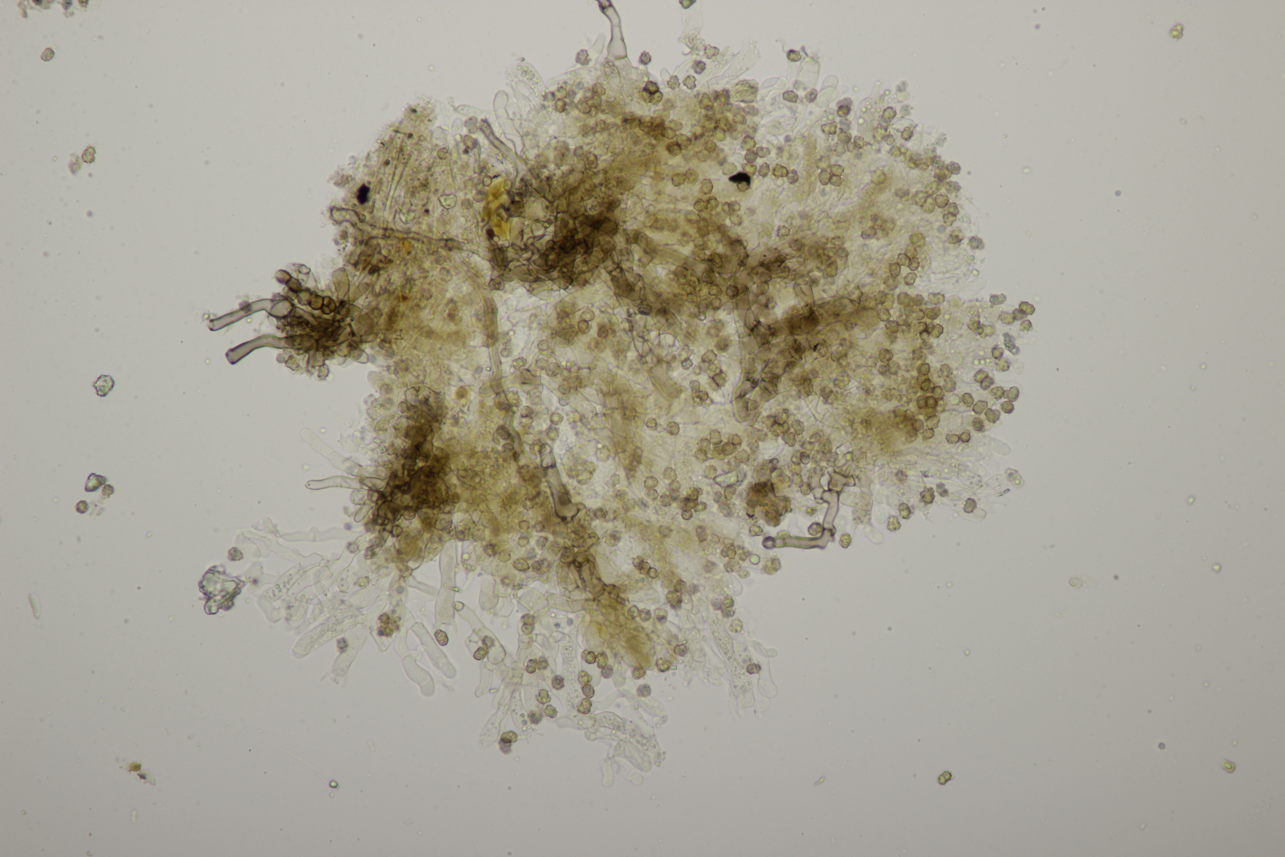 3. An der gleichen Stelle auf einem Holzstückchen dieser Fund. Mikroskopisch offenbar das gleiche wie Fund Nr.2. Hyphen braun, dickwandig, bis 10 µm breit, nicht inkrustiert, Sporen (7.3+-0.5) µm x (5.5+-0.4) µm, unregelmäßig, Schnallen vorhanden, keine Zystiden. Ich tendiere hier zu Thelephora terrestris f. resupinata und frage mal direkt die anderen Tomentella-Sammler: Wie viele Thelephora terrestrisse sammelt ihr im Schnitt, bis ihr mal eine Tomentella erwischt? Hier sind es gefühlt hunderte...