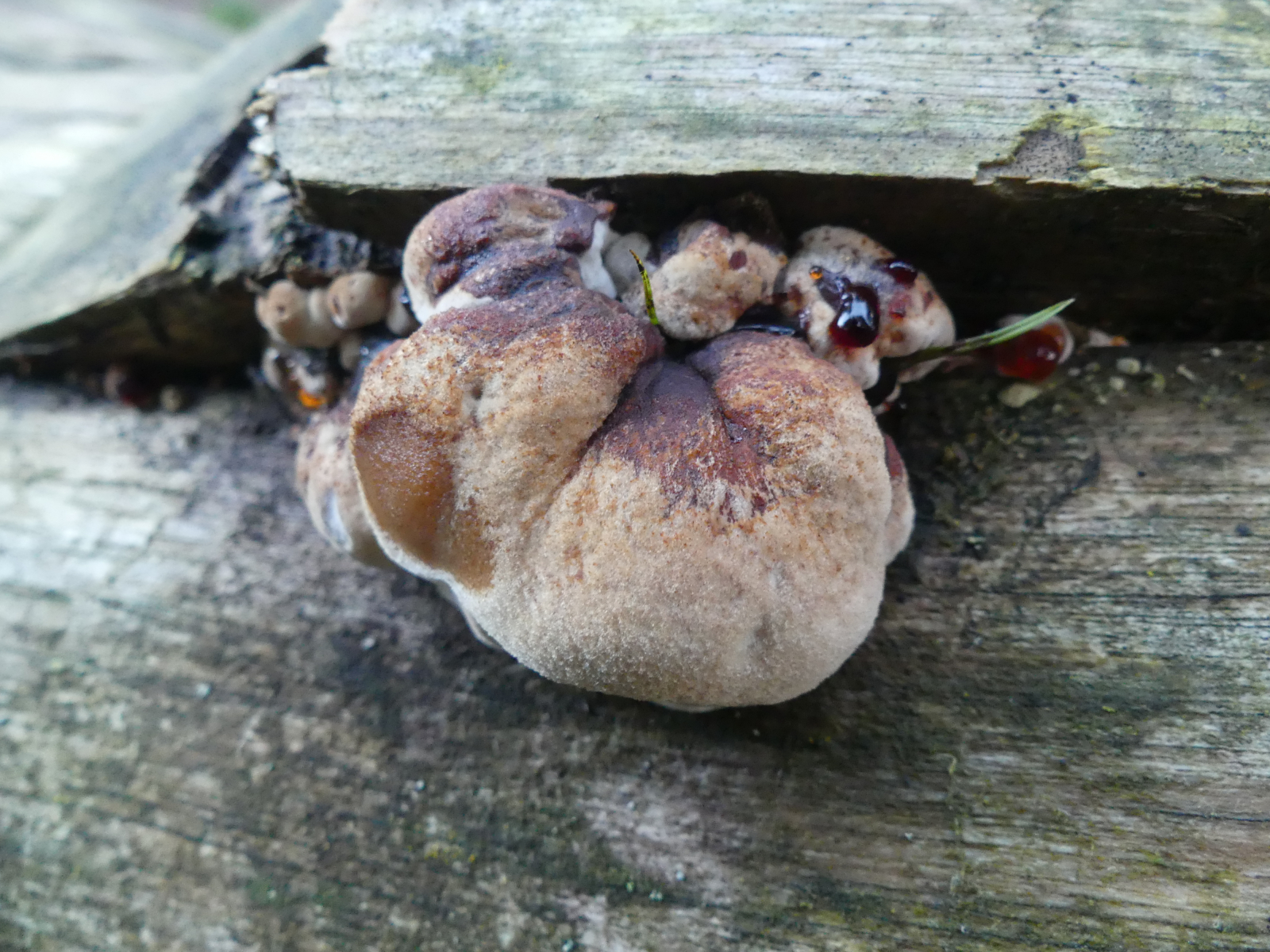 Und der Dritte schaut sehr nach einer Leucogyrophana mollusca aus, die auch hpts an Kiefer und anderen Nadelhölzern wächst.