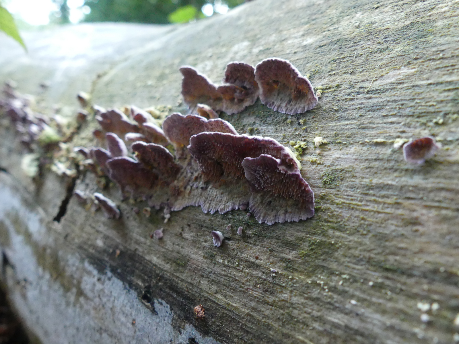 Mit den älteren darunter ist Trichaptum fuscoviolaceum / hollii (Zahnförmiger Violettporling) dann klar, bei mir kommt der immer an Kiefer, aber das kann sicher variieren, wenn man irgendwo weniger Kiefern und mehr Fichten hätte.