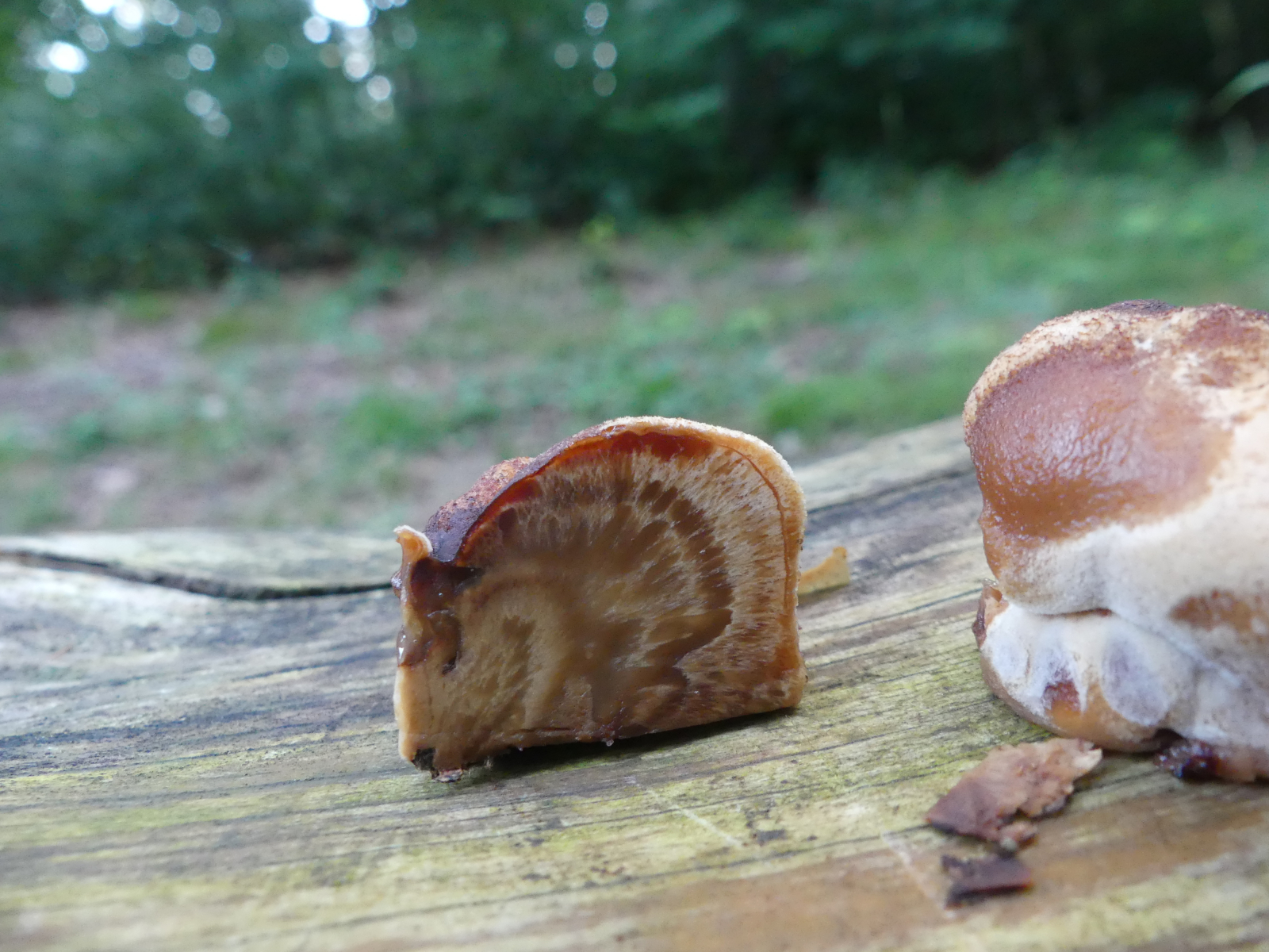 Im Schnittbild ist das auch verblüffend, wenn man Belis Schnittbild von einem fruchtkörper in der finalen, fomitoiden Phase vergleicht (braunes Fleisch ohne Saftzonen) mit den anderen Schnittbildern von Fruchtkörpern in der leptoporoiden Phase, wo das Schnittbild dem eines Leberreischlings echt ähnliich sieht.